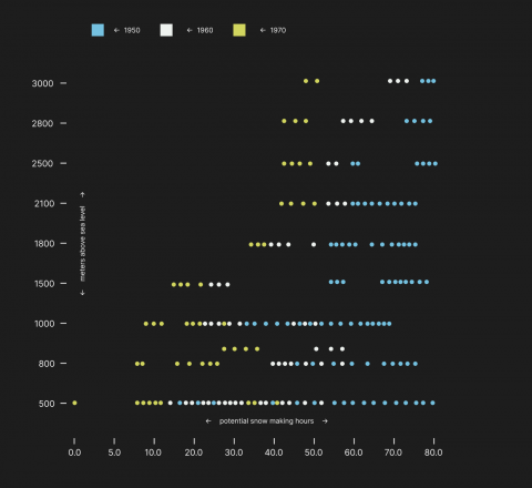Die zweite Variante ist ein Streudiagramm, das die potenziellen Beschneiungsstunden in Bezug auf die Höhenlage über die Jahrzehnte hinweg zeigt. Dies bietet einen tiefen Einblick, wie sich die Bedingungen für Schneeproduktion mit der Höhe und über die Zeit verändert haben. Es ist besonders aufschlussreich, um Trends zu erkennen und die Auswirkungen des Klimawandels zu visualisieren.