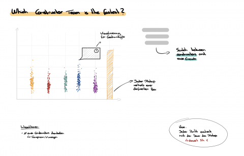 Zu beginn habe ich mir meine zu Visualiserenden Dimensionen aufgeschrieben und erste Zeichnungen angefertigt. Von Heatmap über Sunburst Diagrammen kam ich recht schnell auf ein Balkendiagramm ähnliches Diagramm, welches die Perfomance der einzelnen Racing Teams visualisieren soll.