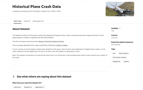 Datensatz-QuelleMein Datensatz zu dem Thema: “Plane Crashes”, habe ich bei Kaggle gefunden. Er beinhaltet alle aufgezeichneten Flugzeugabstürze von 1918 bis 2022. Insgesamt handelt es sich um einen Datensatz von 28.500 Zeilen und 24 Spalten. Der Datensatz ist hier zu finden: https://www.kaggle.com/datasets/abeperez/historical-plane-crash-data/data