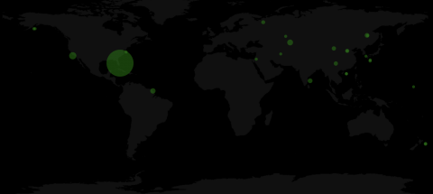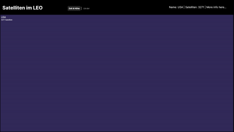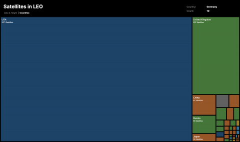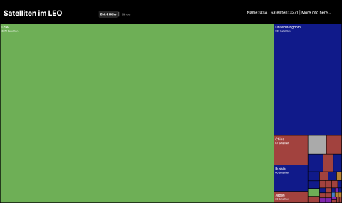 Die zweite Darstellung ist eine vereinfachte Treemap. Jedes Rechteck repräsentiert ein Land und die Fläche des Rechtecks ist proportional zur Anzahl der Satelliten pro Land. Bei den größeren Rechtecken wird auch der Name des Landes und die Anzahl der Satelliten angezeigt. Wenn man mit der Maus über die Rechtecke fährt, kann man auch den Namen und die Anzahl der kleineren Rechtecke oben rechts ablesen. Die Farbe der Rechtecke lässt außerdem Rückschluss auf den Kontinent des Landes schließen.