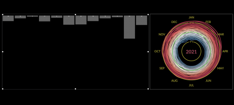 Eine weitere Darstellungsidee war eine Art Strahlendiagramm ähnlich zu dem Bild rechts von der NASA. Dabei laufen die Daten mit einer Animation durch, wobei in der Mitte das aktuelle Jahr und außen im Kreis der Monat zu sehen ist. Der Abstand der Linie von der Mitte entspricht der Anzahl der Starts pro Monat. Gegen diese Darstellung habe ich mich entschieden, da relativ wenige Daten auf einmal erkennbar sind und der Unterschied zwischen den Starts am Anfang und am Ende so groß ist, dass eine proportionale Darstellung nur schwer möglich ist.