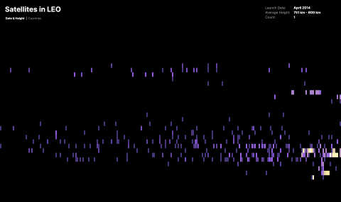 Die erste Darstellung ist eine Heatmap. Die x-Achse stellt die Zeit dar, die y-Achse die Höhe. Jedes Rechteck repräsentiert mindestens einen Start in einem bestimmten Monat eines Jahres und eine entsprechende Höhe. Die Farbe der Rechtecke gibt die Anzahl der Satellitenstarts an. Wenn man über ein Rechteck fährt, sieht man oben rechts den genauen Startmonat mit Jahr und die genaue Höhe. Außerdem wird die Anzahl der Satellitenstarts angezeigt.