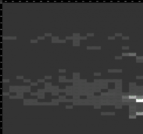 Anfangs habe ich versucht, die Anzahl der Starts durch einen Unterschied in der Opacity der Rechtecke darzustellen. Dabei waren jedoch kleine Unterschiede in der Anzahl der Starts nicht mehr zu erkennen.