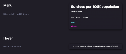 In dieser Ansicht habe ich einen Hover eingebaut der mir oben rechts ausgibt in welchem Jahr wieviele Menschen an Suizid gestorben sind. Zudem kann ich in beiden Ansichten im Menü oben links ein Geschlecht sowie die gewünschte Ansicht auswählen.