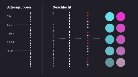 Um das Alter innerhalb eines Strahls darzustellen haben ich den Strahl in 5 kleine Parteien geteilt. Inne ist die jüngste Altersgruppe außen die älteste. Beim Geschlecht habe ich bemerkt das Punkte und Striche nicht optimal geeignet sind da sie den Wert visuell durch den Größenunterschied verfälschen. Daher habe ich einige Farben für Mann und Frau ausprobiert und die finalen passend zum Alter gräulich abgestuft.