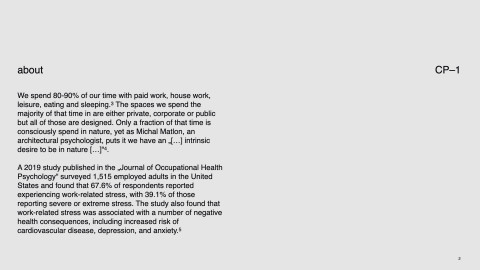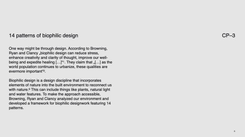 Gründe für unsere Entscheidung waren unter anderem die Ausrichtung auf einen positiven (utopischen) Ansatz, der wünschenswerten Zukunftsgestaltung und dem Potential, das unserer Einschätzung nach in Biophillic Design Prinzipien liegt (weiter unter “Cubicle Entwicklung” erläutert). Im folgenden sind diese aufgearbeitet und beschrieben