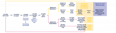 Durch die User Journey haben wir Fragen beantwortet, die uns unklar waren. Hier zeigt sich gut, das Selbständige entweder höheren Beitrag zahlen müssen und durch den späten Lohnausgleich viel Druck besteht gesund zu bleiben.