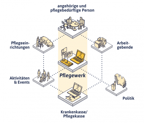 Das Pflegewerk dient nun anerkannt als Vermittler zwischen den Pflegenden und Pflegebedürftigen und Institutionen wie der Kranken- und Pflegekasse. Es übernimmt die Aufklärungsarbeit, sodass Kranken- und Pflegekassen weniger dahingehend unternehmen müssen. Das Pflegewerk kann Pflegenden und Pflegebedürftigen im Prozess mit Informationen zurate stehen und begleitet sie. Des Weiteren arbeitet das Pflegewerk eng mit der Bundesregierung zusammen, um die gesetzlichen Rahmenbedingungen zu schaffen, die sich positiv auf die Pflege auswirken.