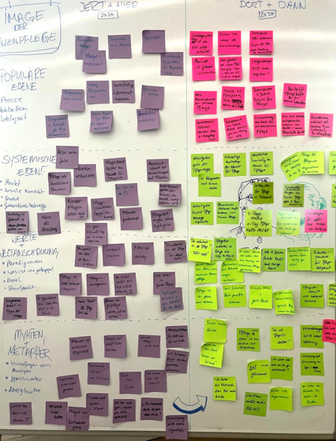 Diese Methode half vor allem dabei, ein gemeinsames Verständnis für das Thema Altenpflege aufzubauen. Man beginnt mit der Dekonstruktion der heutigen Welt, indem man zuerst die oberflächlichen Gegebenheiten wie Schlagzeilen in der Medienlandschaft festhält und anschließend die zugrundeliegenden systemischen Zusammenhänge beschreibt.
