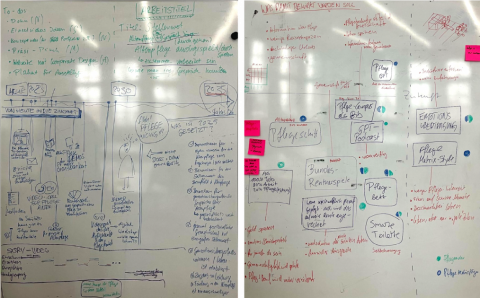 Danach geht man mehrere Ebenen tiefer und benennt die Werte und Metaphern, die aktuell gelebte Handlungsmuster widerspiegeln. Vor allem im Bereich der Werte und Metaphern auf der linken Seite gab es innerhalb des Teams viele Überschneidungen und wiederkehrende Aussagen, wie zum Beispiel auf der Seite über Pflegebedürftige: