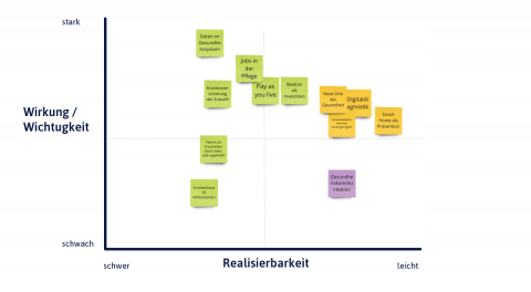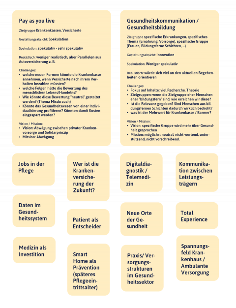 Die verbleibenden Themen wurden erneut im Detail beleuchtet, indem Pros und Contras in Bezug auf die Relevanz des Themas und die Möglichkeit, ein Zukunftsszenario zu gestalten, abgewogen wurden. Dabei standen die Themen “Pay as you live” und “Die Zukunft der Pflege” im Fokus.