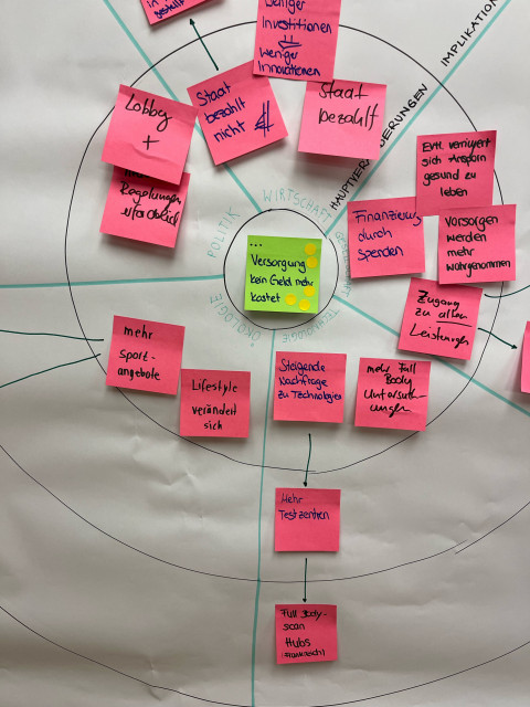 In einem kreativen Brainstorming überlegt wir “Was-wäre-wenn” Fragen bezüglich des Gesundheitssystems. Nach der Ideensammlung wurde durch ein Dot-Voting die beliebteste Frage ermittelt, die als Ausgangspunkt für das Futures Wheel diente. Die ausgewählte Frage lautete: “Was wäre, wenn die medizinische Versorgung kein Geld mehr kostet?”