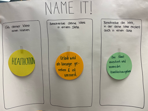 Aus dem Futures Wheel haben wir uns schlussendlich für den Lösungsansatz eines bezahlten Healthcare Urlaubs geeinigt und diesen in der Name-it Vorlage prägnant formuliert.