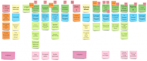 Bei der Planung des Workshops wurden Schlüsselfragen berücksichtigt, um einen effizienten und zielgerichteten Ablauf sicherzustellen. Dazu gehörten Überlegungen zur Zeitplanung für verschiedene Methoden, klare Definition von Aufgaben während des Workshops und eine sinnvolle Teamaufteilung. Definierte Aufgaben während des Workshops umfassten die Moderation, Vorbereitung von Materialien, Dokumentieren von Ideen und Ergebnissen sowie die Unterstützung bei methodischen Verständnisfragen.