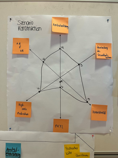 Nach der Identifikation dieser Schlüsselfaktoren wurden im Team die Schlüsselfaktoren nach ihrer Entwicklung bis 2035 durch Nummern eingestuft (s. Abbildung). Schlussendlich lag im Team der Fokus auf Konnektivität und das diese in Zukunft eine zentrale Rolle spielen wird, wodurch das Szenario Gesundheit verbindet entstand.