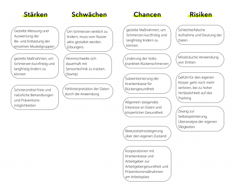 Es folgte eine Auseinandersetzung mit den Stärken und Schwächen unseres Konzeptes, sowie den Chancen und Risiken. Vorteil dieser Methode ist die Visualisierung, um explizit Stärken hervorheben zu können und bei etwaigen Schwächen und Risiken eventuell nochmal nachzuschärfen und Teile anzupassen.