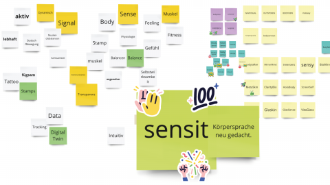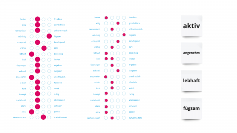 Die Visuelle Ausarbeitung der Marke starteten wir mit zwei Semantischen Differenzialen. Das Ergebnis ist, dass unsere Marke aktiv und lebhaft, aber auch angenehm und und fügsam sein soll. Abschließend folgt eine Wordcloud, bei der wir die genannten Begriffe kombinierten, erweiterten und uns schließlich auf “Sensit” einigten. Eine Kombination aus den englischen Begriffen Sense und Sit.
