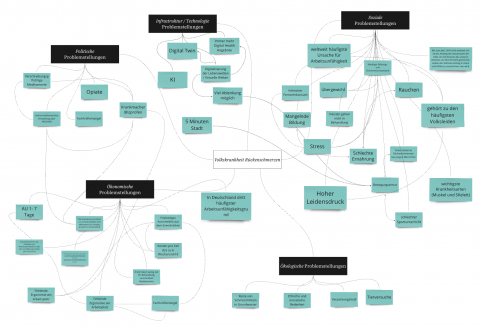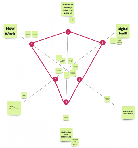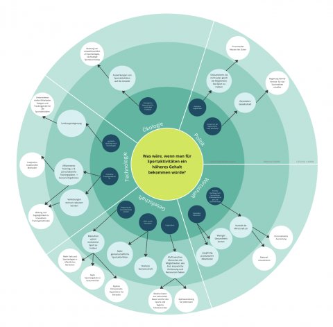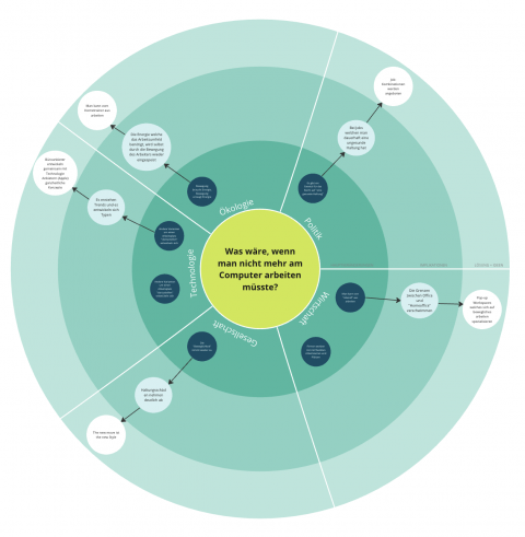 Für eine Perspektivöffnung und die Generierung von unterschiedlichen Lösungsansätzen fertigten wir mehrere Futures Wheels mit unterschiedlichen „Was wäre, wenn“ Fragen an.