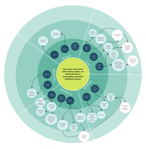 In diesem Future Wheel sind die Hauptveränderungen, dass alternative Behandlungsmethoden verstärkt eingesetzt werden, man dadurch Schmerzmittelabhängigkeiten vorbeugt und bewusster mit Schmerzmittel umgeht. Es würde Gesetze geben, die Betäubungsmittel oder Heilmittelgesetze stärken, dadurch hätten Ärzte eine größere Hürde, um Schmerzmittel zu verschreiben und müssten sich auch mehr Zeit nehmen, um über Medikation aufzuklären.