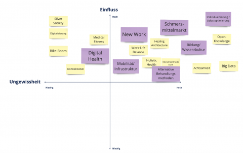 Die Trends und Signale, welche wir durch die STEEP-Analyse ermittelten, haben wir anschließend nach ihrem Einfluss und ihrer Ungewissheit in Bezug zur Zukunft eingeordnet. Für uns ergaben sich sechs Schlüsselfaktoren, welche wir zentral für die Zukunftsentwicklung bei der Thematik Rückenschmerzen sehen. Darunter zählt New Work, Digital Health, Mobilität und Infrastruktur, Medikation und Behandlung, Bildung und Wissenskultur, Individualisierung und Selbstoptimierung.