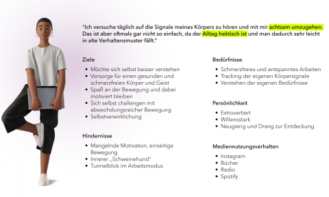 Greta arbeitet bei einer großen Softwareentwicklungsfirma in einer Großstadt in Deutschland. Sie ist 32 Jahre alt und hat vor 3 Jahren ihren Master absolviert, seit dem arbeitet sie. Die Firma für die sie arbeitet bietet attraktive Vorsorgemöglichkeiten für die Arbeitnehmer, um einen gesunden Rücken zu haben und diesen auch durch gezielte Trainings und Fitnessangebote zu tracken. Sie ist mit einem ergonomischen Stehschreibtisch und Bürostuhl ausgestattet, sodass sie den Tag über in verschiedenen Positionen arbeiten kann. Greta nutzt außerdem die Freizeitsportangebote, die ihr Arbeitgeber anbietet und geht mit ihren Kollegen einmal in der Woche ins Yoga. Greta achtet auf ihre Gesundheit und versucht die Signale ihres Körpers möglichst wahrzunehmen, das gelingt ihr allerdings nicht immer. Sie wünscht sich Hilfe, um ihre Signale besser verstehen zu können und einen Ansporn, um sich selbst zu challengen und gesund zu bleiben.