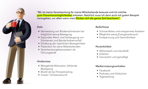 Horst arbeitet im mittleren Management bei einer großen Automobilfirma. Er leitet ein Team aus ca. 20 Angestellten. Er geht gerne zur Arbeit, hat aber auch die Möglichkeit im Home Office zu arbeiten. Diese Möglichkeit nutzt er vor allem, wenn er abends noch mal seine Mails checkt. Seine Firma bietet ein gutes Vorsorgeprogramm für die Rückengesundheit an, das nutzt er aber nicht, da er eher der gemütliche Typ ist. Er weiß, dass er sich mehr bewegen müsste, da er vor ein paar Jahren einen Bandscheibenvorfall hatte, der ihm schwer zugesetzt hat. Horst bewegt sich in seiner Freizeit nur, wenn er mit seinem Hund spazieren geht. Tagsüber sitzt er die meiste Zeit vor dem Computer. Er weiß, dass er seinen Stehschreibtisch auch nutzen könnte, das ist ihm aber zu aufwendig. Mit diesem Fitnesswahn, wie er ihn beschreibt, kann er wenig anfangen. Die Signale seines Körpers spürt er erst, wenn er Schmerzen hat. Als Führungskraft ist ihm aber die Verantwortung für seine Mitarbeitenden durchaus bewusst. Daher möchte er Präventionsmöglichkeiten für Rückengesundheit und ein gutes Miteinander schaffen. Als Chef sollte er auch mit gutem Beispiel vorangehen, vor allem weil sich sein Rücken auch öfter beschwert.