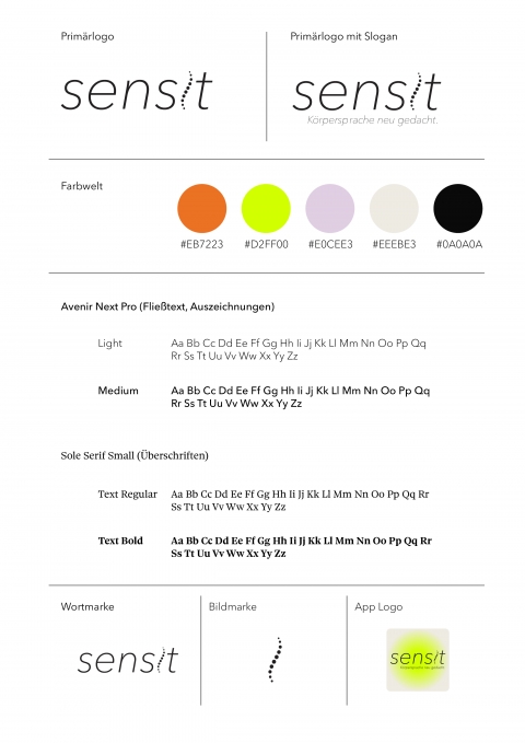 Unsere Wort-Bildmarke setzt sich aus einer kreisförmig angelegten Wirbelsäule, die ein S formt, sowie dem Wort “sensit” zusammen. Das “i” in “sensit” wird durch die Wirbelsäule angedeutet. Das Logo ist kursiv gesetzt, um die Dynamik und Bewegung zu reflektieren, die wir mit unserem Produkt bei den Nutzern auslösen und fördern möchten. Die Wort-Bildmarke wird sowohl mit unserem Slogan “Körpersprache neu gedacht” als auch eigenständig verwendet. Sie kann als App-Icon mit unserem kreisförmigen Farbverlauf im Hintergrund platziert werden oder steht allein mit dem Slogan auf der Verpackung.