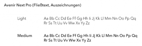 Für die Typografie haben wir uns für eine Kombination aus serifenloser und Serifenschrift entschieden. Diese Mischung vermittelt einen modernen und klaren Eindruck. Avenir Pro Next ist eine Weiterentwicklung des Avenir-Schnitts in Zusammenarbeit von Adrian Frutiger mit dem Monotype Type Director Akira Kobayashi. Diese Schriftfamilie zielt nicht nur auf eine Weiterentwicklung ab, sondern soll auch technische Spezifikationen verbessern und die Lesbarkeit auf Bildschirmen erleichtern. Avenir Next Variables sind Schriftdateien mit zwei Achsen: Gewicht und Breite. Sie bieten vordefinierte Instanzen von UltraLight bis Heavy und Condensed bis Roman Width (URL: https://www.myfonts.com/de/collections/avenir-next-pro-font-linotype (Abfrage am 02. Februar 2024)). Die Avenir Next Pro wird in den Schnitten Light sowohl in der Wort-Bildmarke als auch im Fließtext und für Auszeichnungen verwendet.