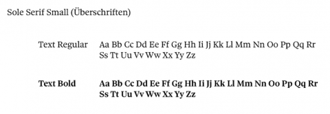 Sole Serif Variable ist eine Serifenschrift, entworfen von Luciano Perondi, mit Merkmalen aus der Buchtypografie. Sie wurde speziell für die Produktion von Zeitungen entworfen und ist so angepasst, dass sie den rauen Gebrauch beim Zeitungsdruck ohne Qualitätsverlust übersteht (URL: https://www.myfonts.com/de/collections/sole-serif-font-cast?tab=techSpecs (Abfrage am 02. Februar 2024)). Die Sole Serif wird im Schnitt Text Bold für Überschriften verwendet.