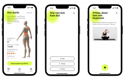 Die App beinhaltet zudem eine Übersicht der täglichen Rückengesundheit unter dem Navigationspunkt „Historie“. Das hilft dem Nutzer seine Rückengesundheit langfristig nachvollziehen zu können und bietet gegebenenfalls eine Basis für ein Arztgespräch, falls dieses notwendig sein sollte. Zudem stellt sensit auf Basis der gesammelten Daten des Nutzer auch passende Übungseinheiten zusammen, die auch mal durchgeführt werden können, auch wenn der Rücken momentan keine Probleme aufweist. Damit wird die Stärkung des Rückens weiter gefördert. Diese individuell zusammengestellten Übungen können unter dem Navigationspunkt “Übungen” abgerufen werden.