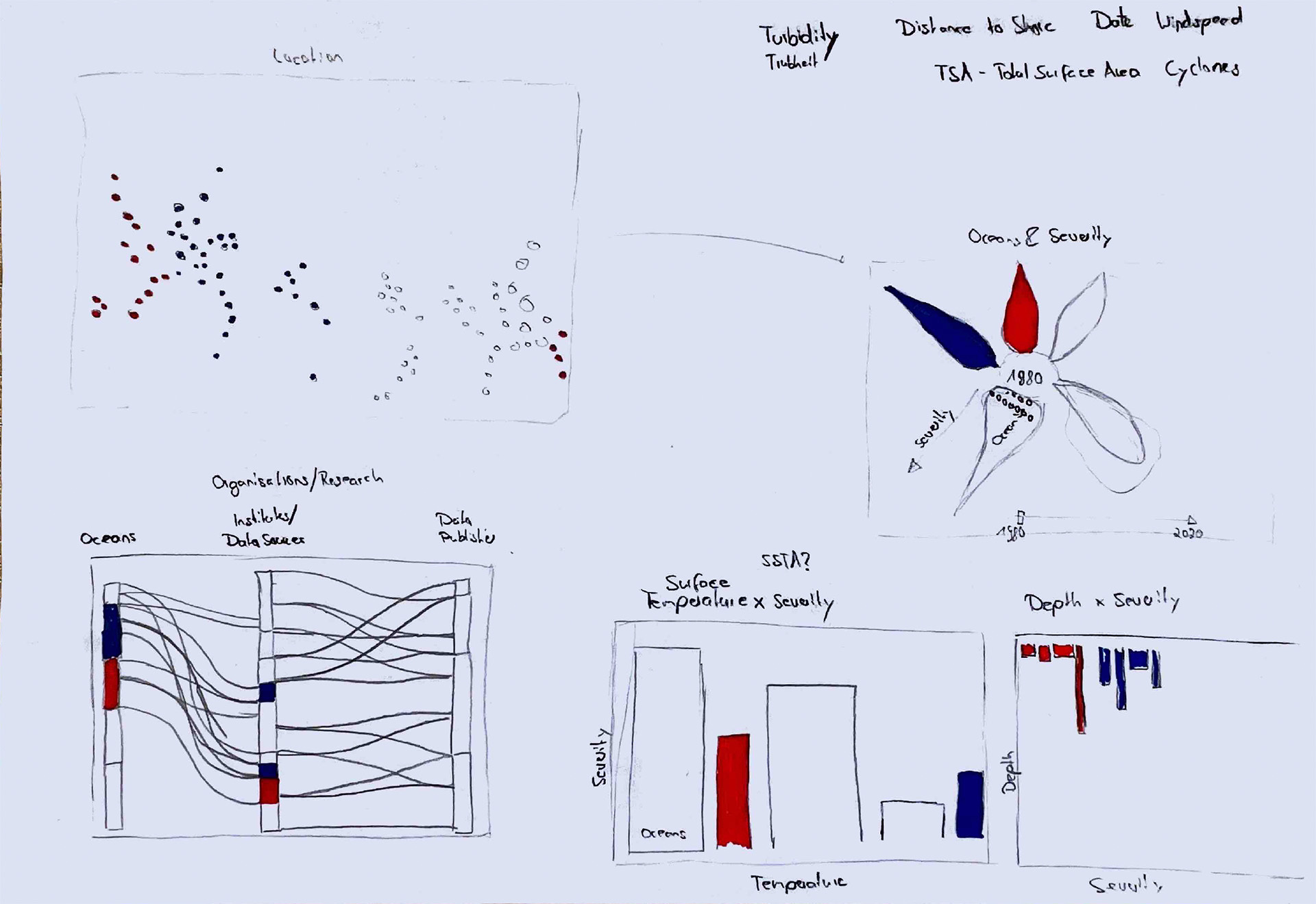 This was my first concept inspired by some diagrams we saw during our lessons. I wanted to split the data amongst the five oceans to give a nice overview of each one. I also thought of splitting it into realms, an even more precise localization of the data. Since this topic is familiar to me i made some visualizations that i thought would look with the data i assumed the dataset would provide to me. But damn was i off with my assumptions….
