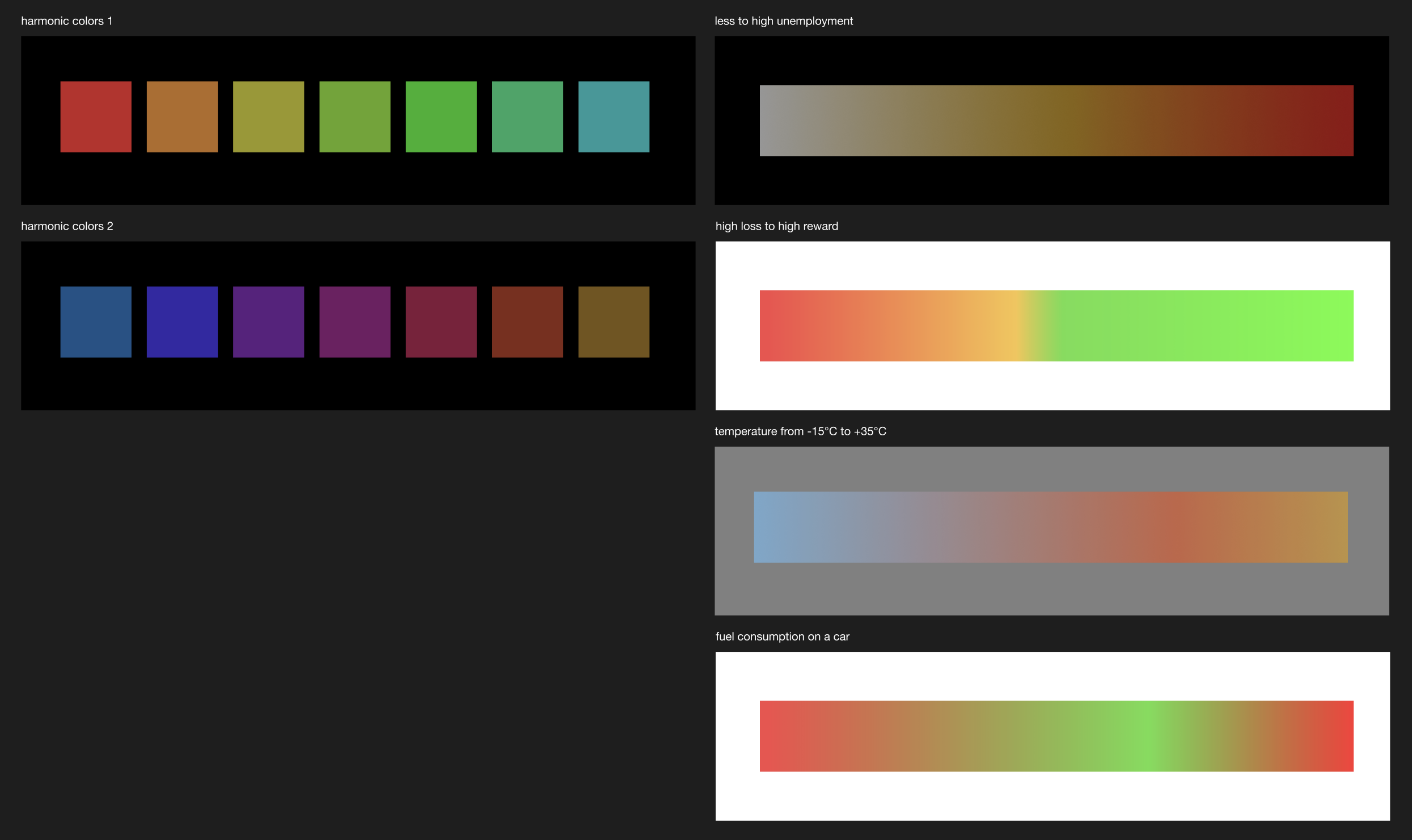 Before we started with our dataset and visualizations we did some presentations about color and famous personalities who did important work in this sector. Later we talked about some map projections and diagram types before we even selected our own dataset. This was because we needed some training with color, gradients and color scales. We even did some by ourselves to train this a bit. Here are some of my gradients: