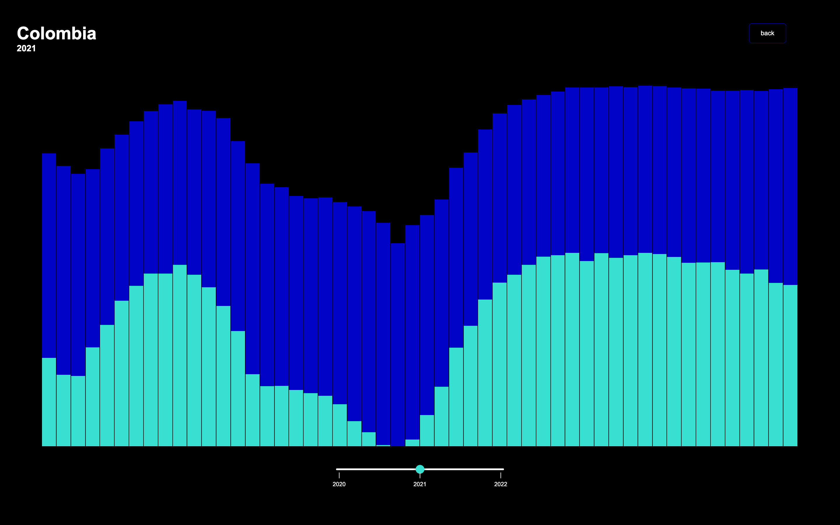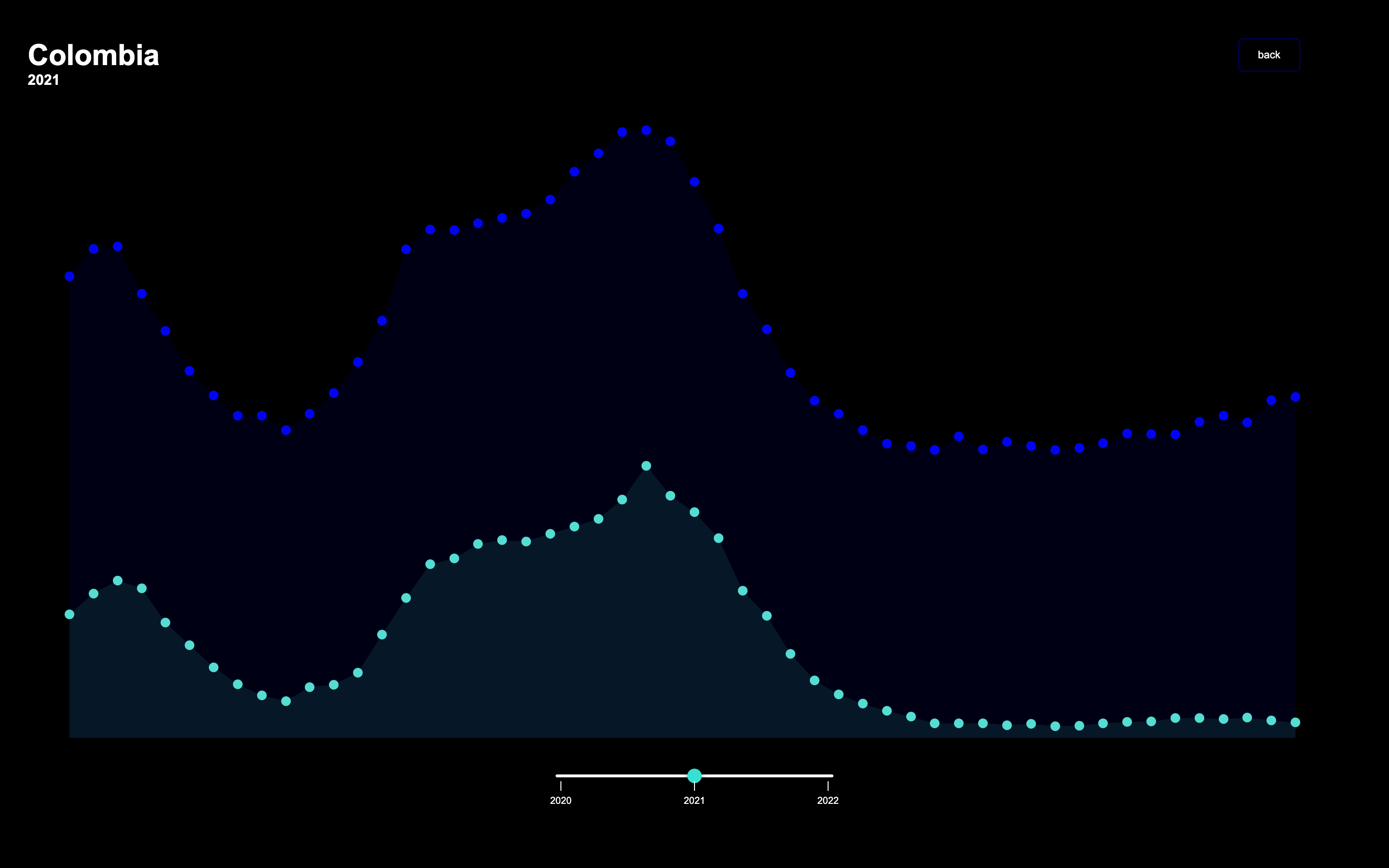 Der zweite Screen zeigt nach Auswahl eines Landes die wöchentliche Gesamt- und COVID-19-Todesfallanzahl. Diese Daten werden in einer Flächen gefüllten Scatterplot dargestellt, die sich für jedes Land und Jahr neu zeichnet. Beim hovern mit der Maus über einen Punkt wird dieser animiert und vergrößert sich. Nachdem die Maus entfernt wird, kehrt der Punkt zur normalen Größe zurück. Während des hovern erscheint ein Info-Panel für jeden Punkt, das die Woche, den Monat und die Todesfälle pro Woche anzeigt in der sie der Punkt befindet. Blaue Punkte repräsentieren die Gesamttodesfälle des Landes pro Woche, während türkisfarbene Punkte die COVID-19-Todesfälle des Landes pro Woche anzeigen. Durch Klicken auf einen Punkt gelangt man zum letzten, dritten Screen.
