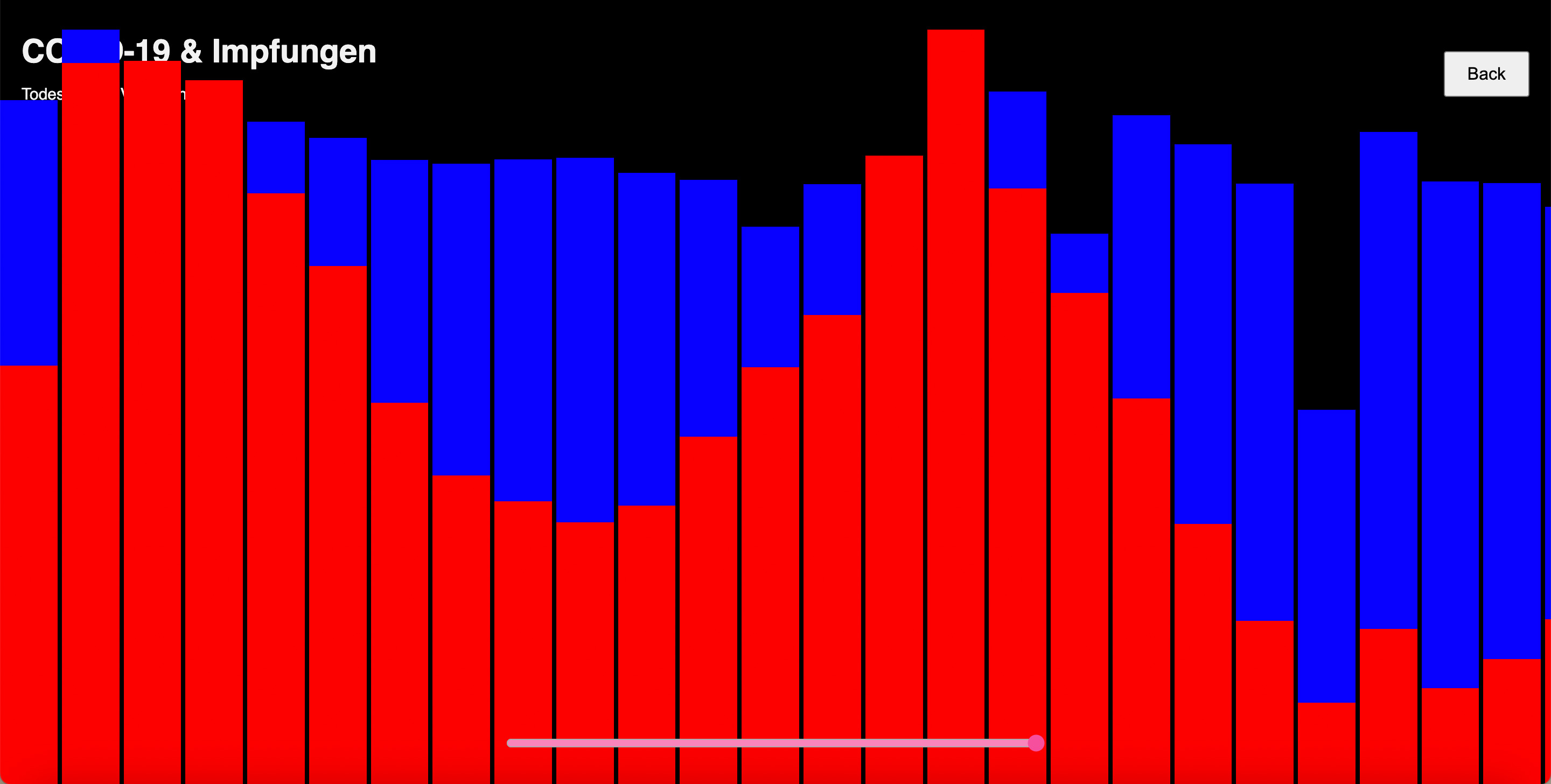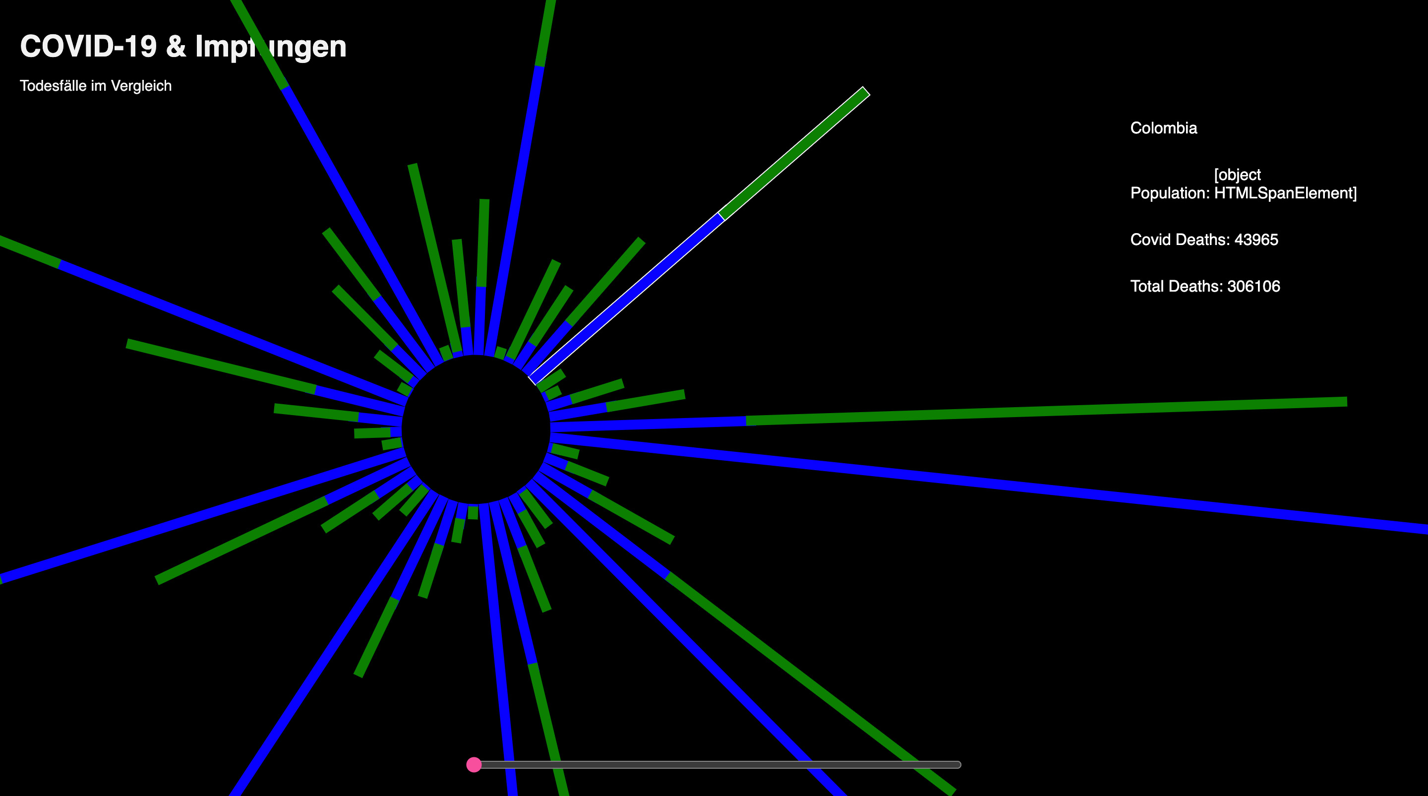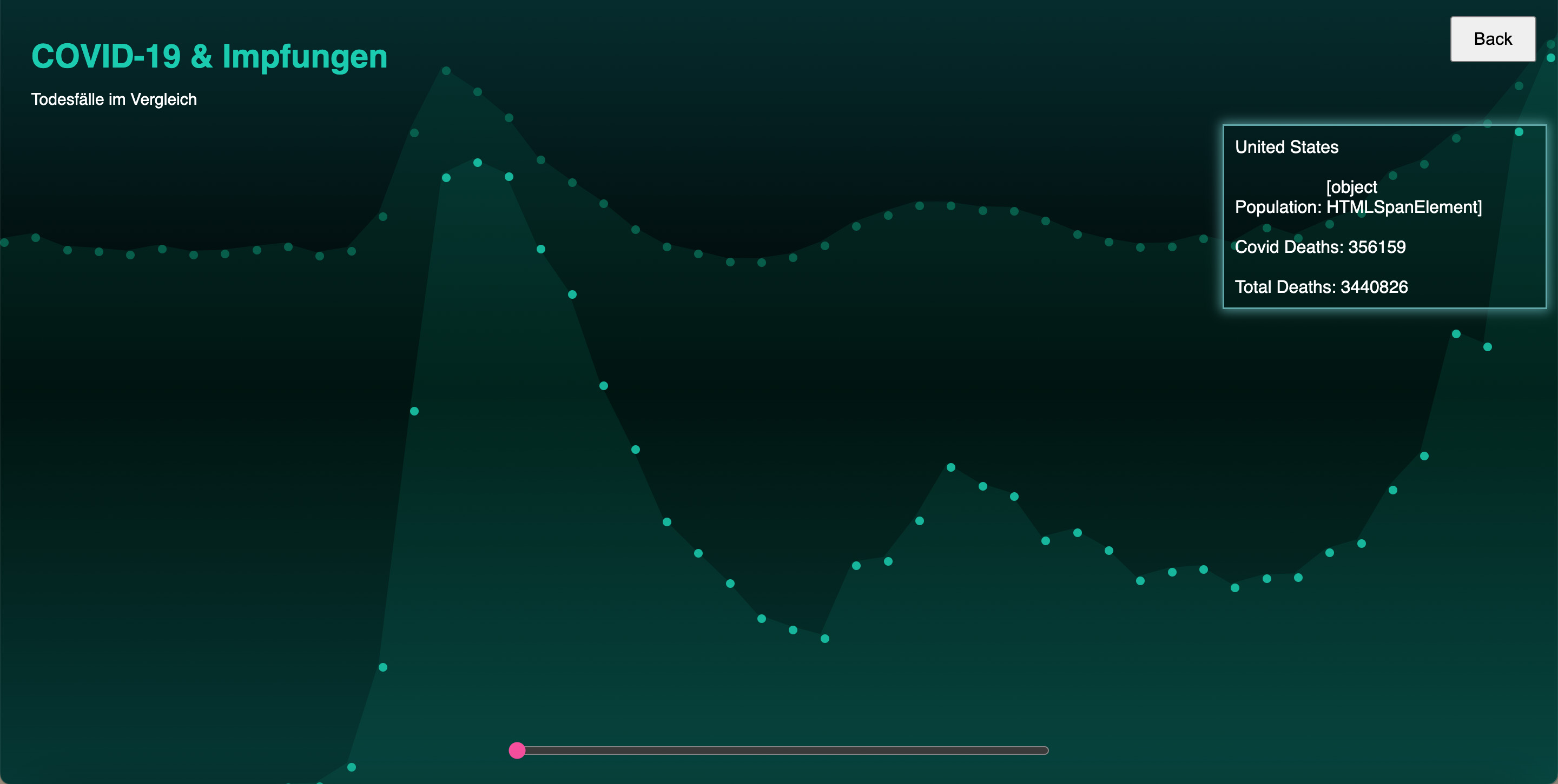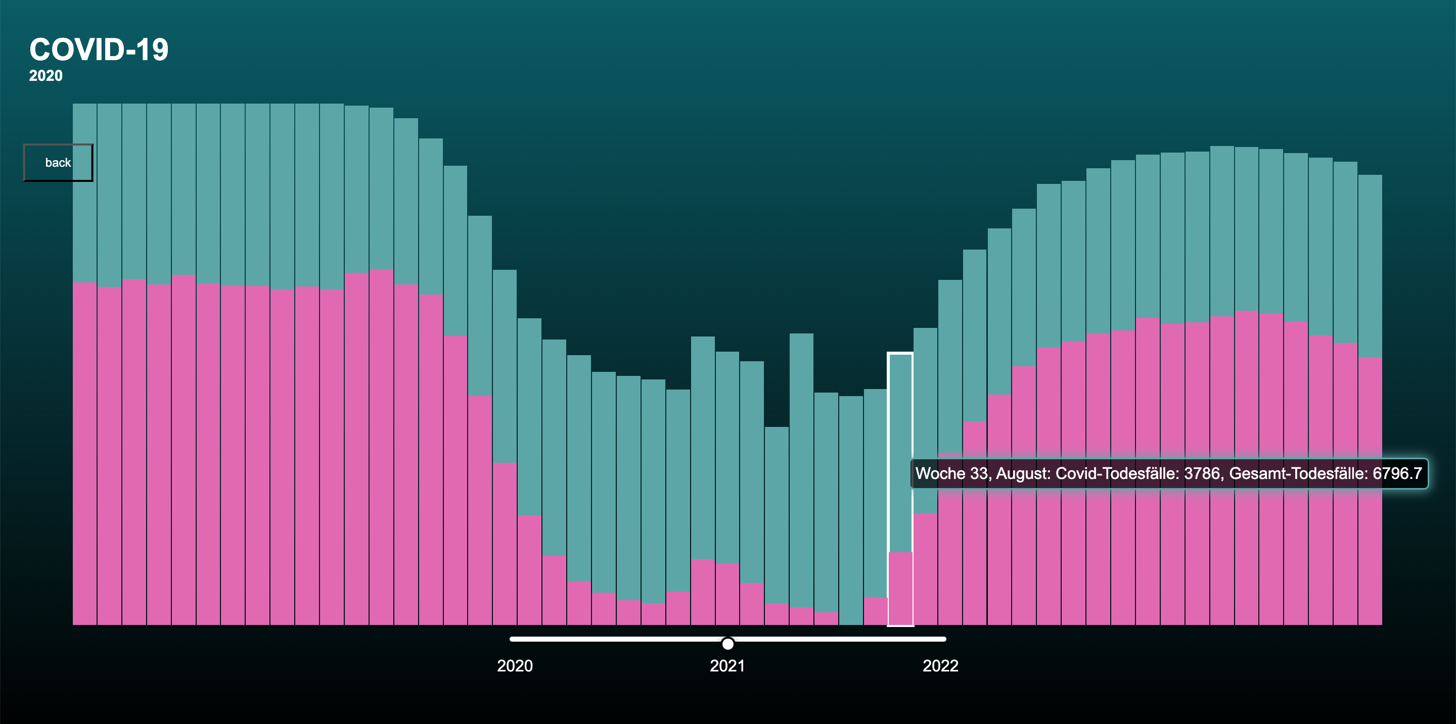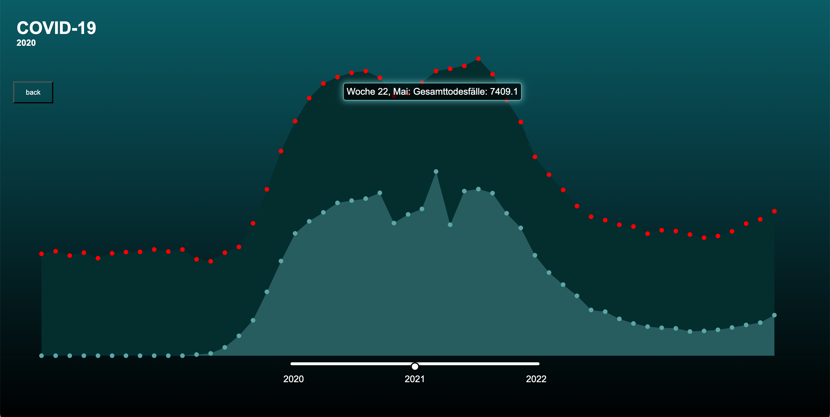 Nachdem der erste Screen funktionierte, ging ich zur zweiten Ansicht über. Die erste Ansicht zeigte eine Jahresübersicht der Gesamttodesfälle und der COVID-19-Todesfälle für jedes Land. In der zweiten Ansicht wollte ich die wöchentlichen Todesfälle besonders hervorheben. Wie bereits erwähnt, fand ich diesen Datensatz besonders interessant, da er wöchentlich ist und daher starke Schwankungen aufweist. Dies machte ihn sowohl visuell als auch inhaltlich sehr ansprechend für dieses Projekt. Ich begann erneut mit einem Balkendiagramm, doch nach einiger Zeit wollte ich gerne etwas mit Punkten umsetzen und kam schließlich zu einer Scatterplot-Ansicht und gefüllten Flächen. Diese sind keine SVGs sondern werden vom Code immer neu gezeichnet.