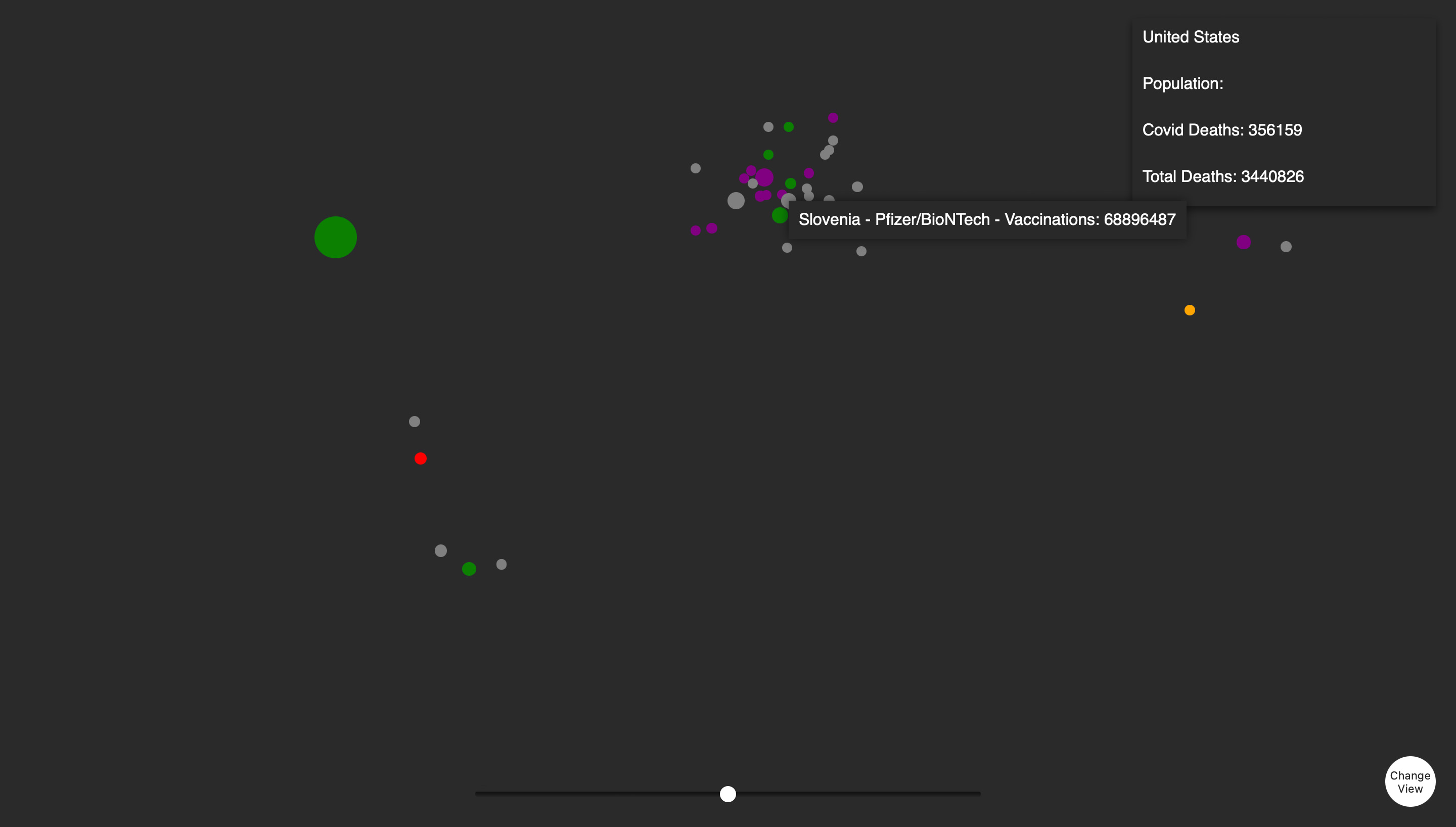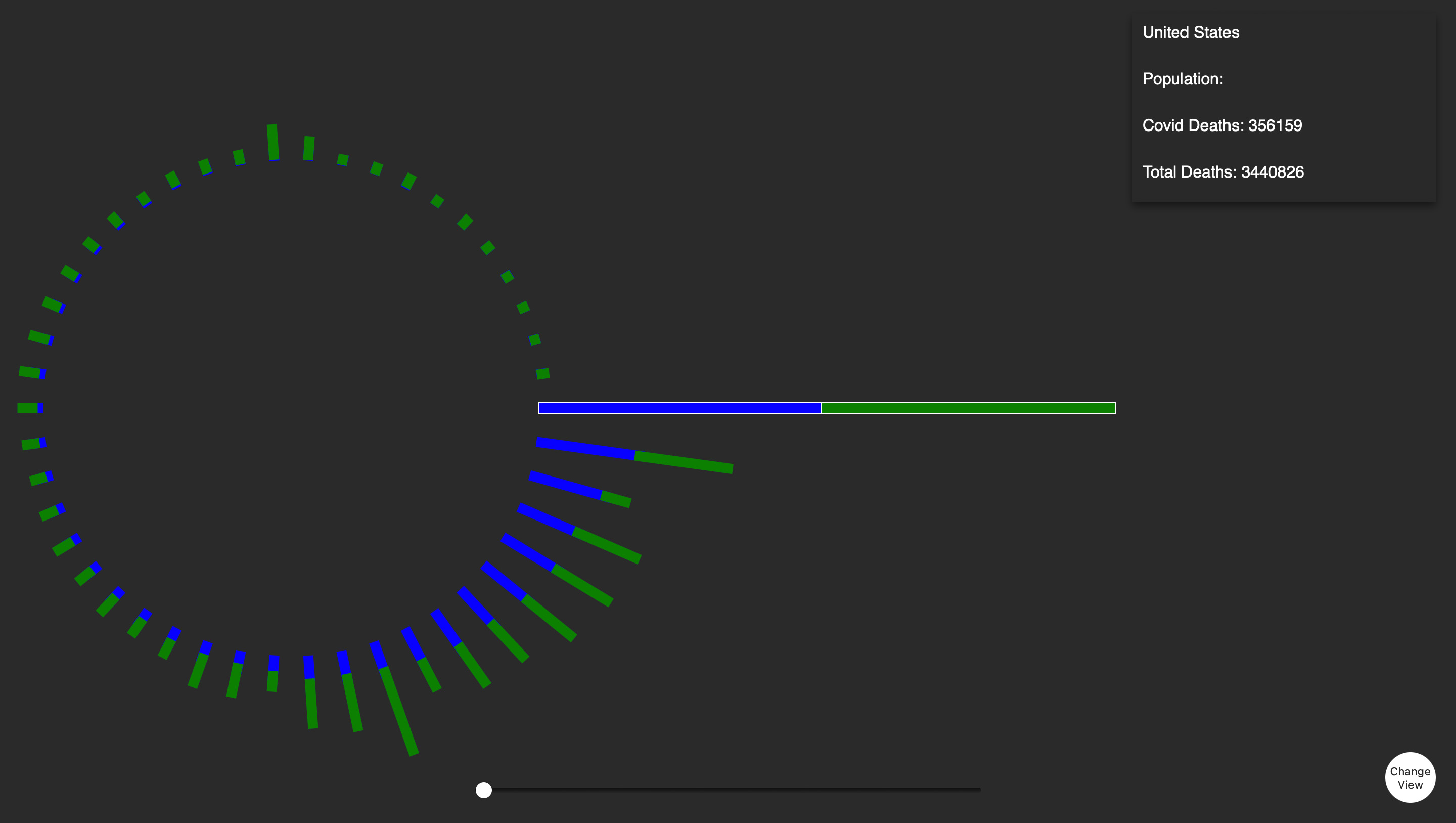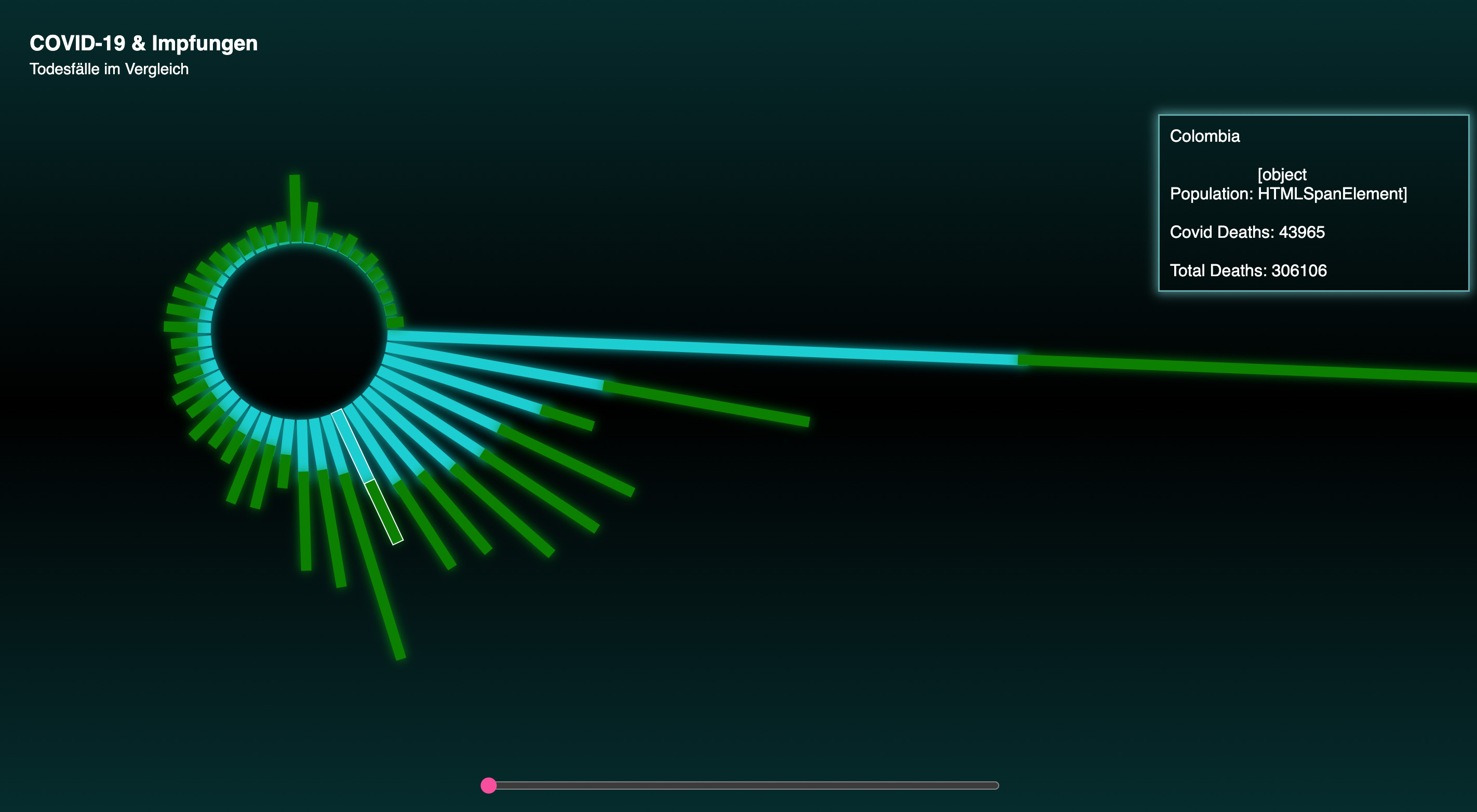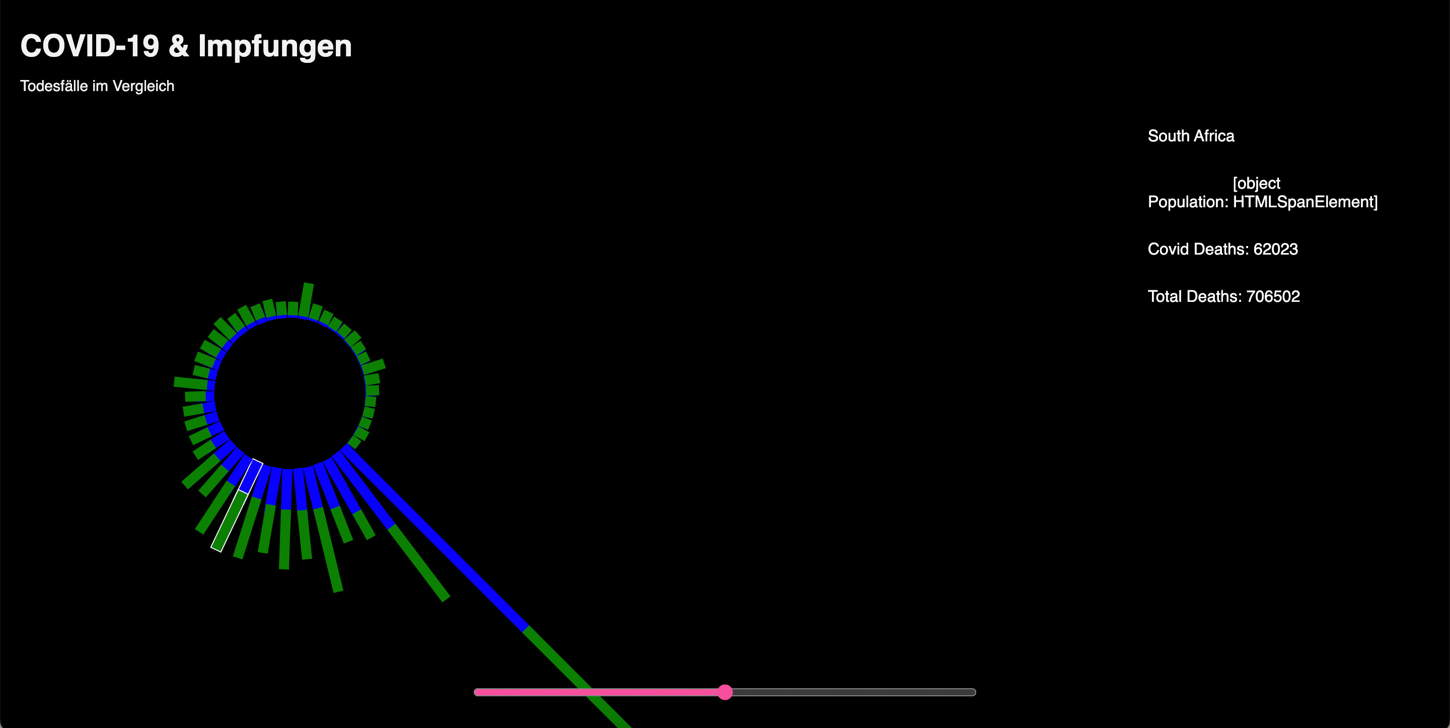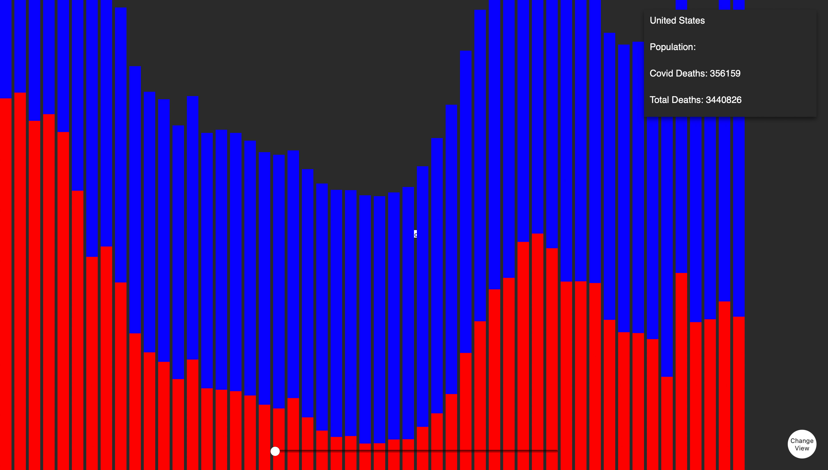 Nachdem der erste Screen funktionierte, ging ich zur zweiten Ansicht über. Die erste Ansicht zeigte eine Jahresübersicht der Gesamttodesfälle und der COVID-19-Todesfälle für jedes Land. In der zweiten Ansicht wollte ich die wöchentlichen Todesfälle besonders hervorheben. Wie bereits erwähnt, fand ich diesen Datensatz besonders interessant, da er wöchentlich ist und daher starke Schwankungen aufweist. Dies machte ihn sowohl visuell als auch inhaltlich sehr ansprechend für dieses Projekt. Ich begann erneut mit einem Balkendiagramm, doch nach einiger Zeit wollte ich gerne etwas mit Punkten umsetzen und kam schließlich zu einer Scatterplot-Ansicht und gefüllten Flächen. Diese sind keine SVGs sondern werden vom Code immer neu gezeichnet.