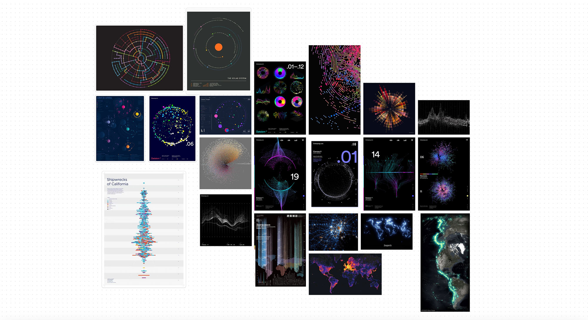 Auf der Suche nach weiteren Ideen holte ich mir Inspiration anhand von anderen visualisierten Datensätzen, die mich faszinierten. Daraufhin erstellte ich ein Moodboard mit Beispielen, die mir besonders gefielen und mich inspirierten. Mir war früh klar, dass ich für meine Gestaltung ebenfalls mit Punkten oder Balken arbeiten möchte.