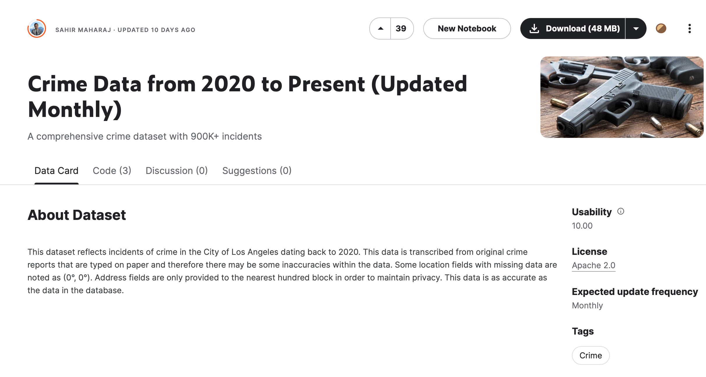 Mein Datensatz umfasst die Verbrechen in Los Angeles von den Jahren 2020 bis 2024. Der Datensatz stammt von Kaggle.com und beinhaltet 24 Spalten, von denen ich mir 5 zu brauchen gemacht habe. Diese 5 Spalten beinhalten verschiedene Positionsdaten wie Breiten- und Längengrade sowie die Schwere der Taten, welche in Crime Levels codiert sind und dazu die Menge an Verbrechen. Zusätzlich enthält er Zeitdaten, also um welche Uhrzeiten die Verbrechen begangen werden. Es war interessant zu untersuchen, ob es Zusammenhänge zwischen Uhrzeit und Verbrechensmenge in den verschiedenen Crimelevels gibt und auch wie sich diese untereinander in Los Angeles unterscheiden.