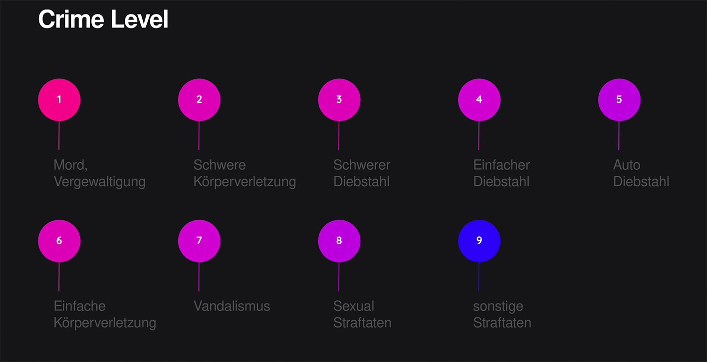 Die ursprünglichen Crimelevels waren in dreistelligen Codes angegeben, wobei jeder Code eine individuelle Tat darstellte (z. B. 110, 354, 341 …). Es gibt insgesamt 9 unterschiedliche Crimelevels. Ich habe diese Codes abgerundet und in einstellige Codes umgewandelt, indem ich ungefähr bestimmte, welche Tat welchem Code entspricht.