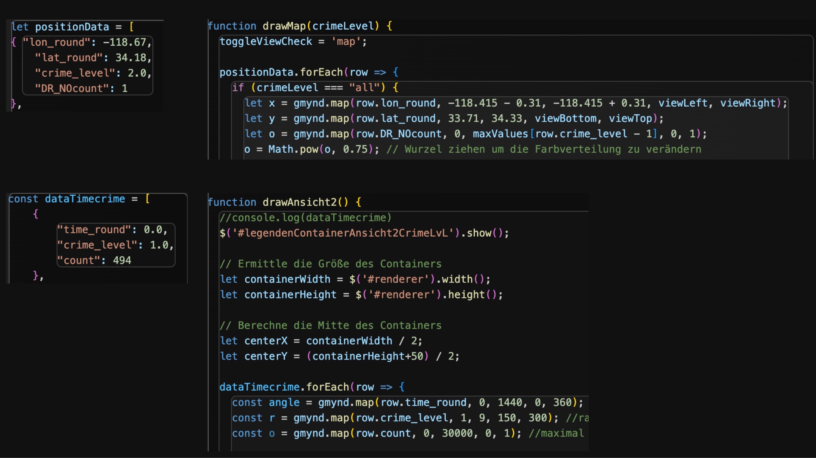 Nachdem meine Daten vorbereitet waren, exportierte ich den Datensatz mit einem weiteren Befehl auf Kaggle als CSV-Datei und konvertierte ihn in eine JSON-Datei. Anschließend integrierte ich meine Daten als Array in zwei Konstanten namens “positionData” in meiner data.js und und “dataTimecrime” in meine dataTimecrime.js. Ich zwei, weil ich positionData für meine 1. Ansicht brauche und dataTimecrime für meine 2. Ansicht.