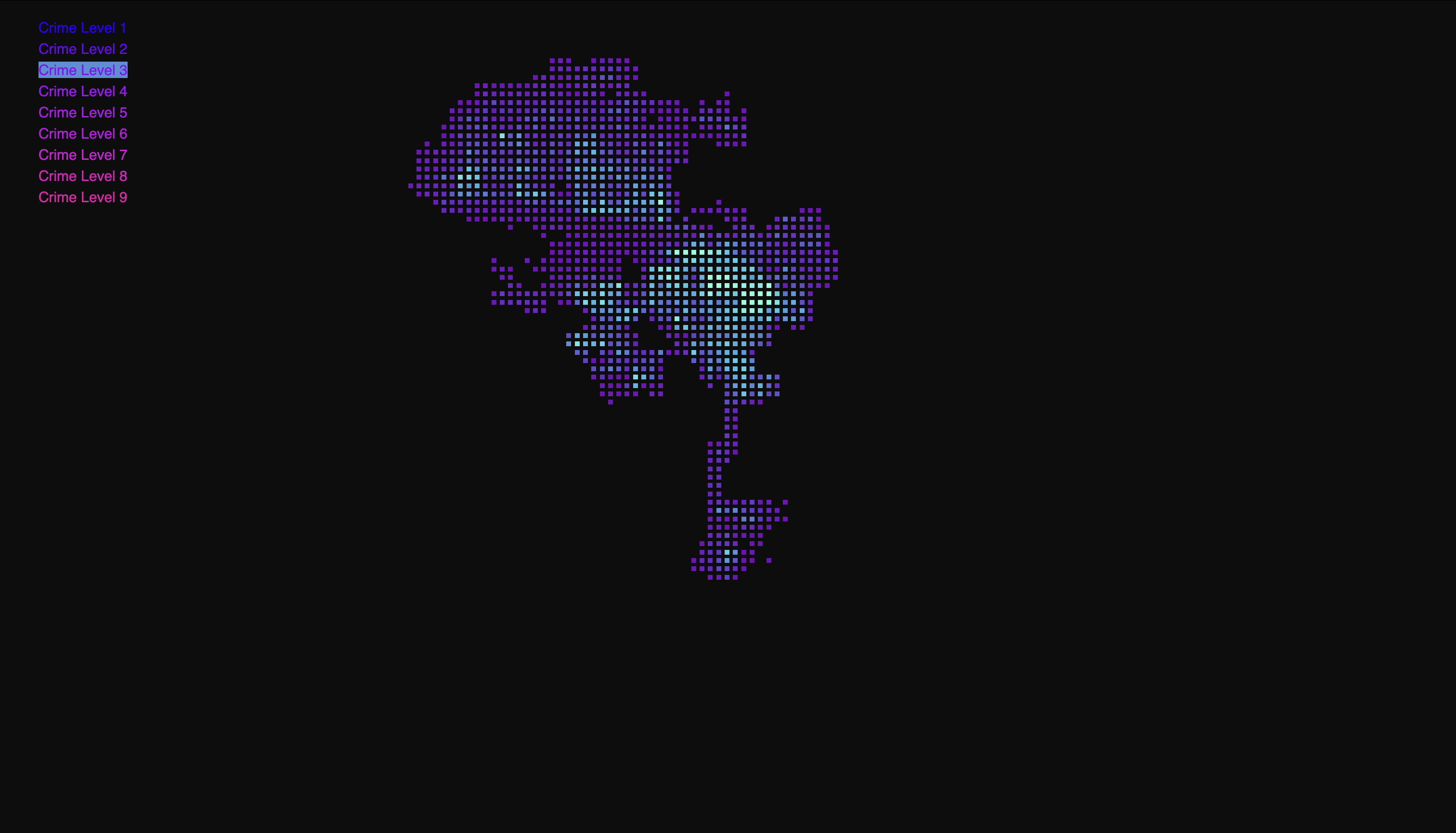 Da ich mich entschieden habe, mich in der ersten Ansicht auf die Heatmap zu fokussieren, habe ich die vorhandenen Parameter und die zu beantwortenden Fragen nochmals überprüft. Anschließend beschloss ich, statt der Jahre die Crimelevels auf der Karte darzustellen. So kann man jedes Crimelevel von 1 bis 9 anklicken und auf einen Blick durch die Farbintensität sehen, in welchen Bereichen die meisten Verbrechen dieser Kategorien stattfinden.