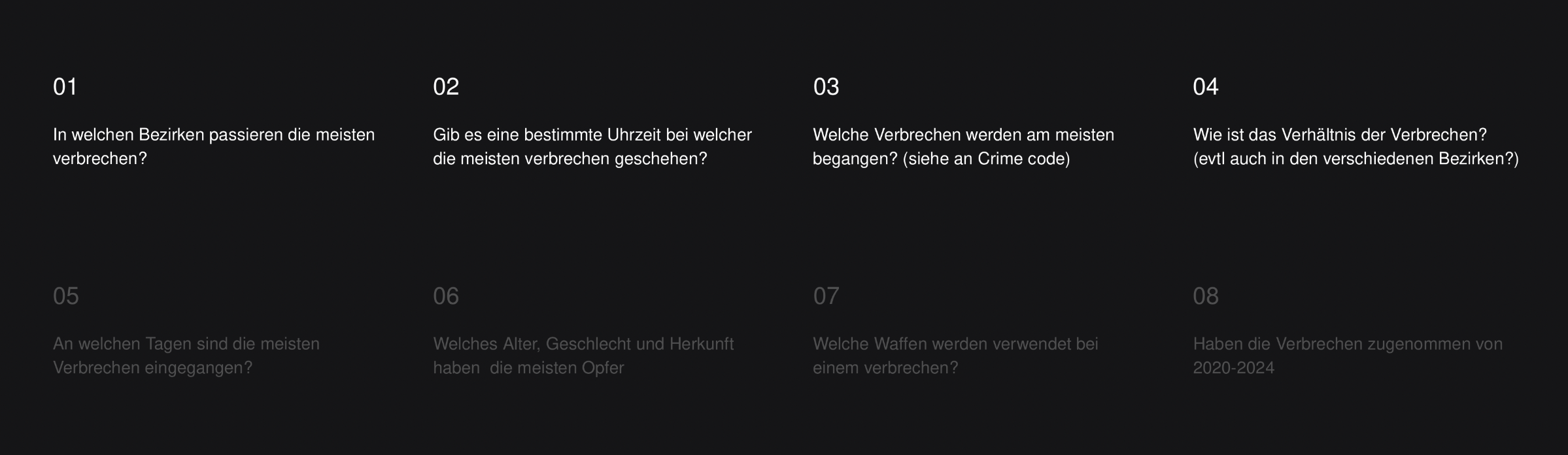 Um mir klar zu werden, welche Informationen ich visualisieren möchte, habe ich Fragen an meinen Datensatz gestellt. Letztendlich habe ich mich auf die Fragen 1-4 konzentriert und versucht zu Visualisieren.