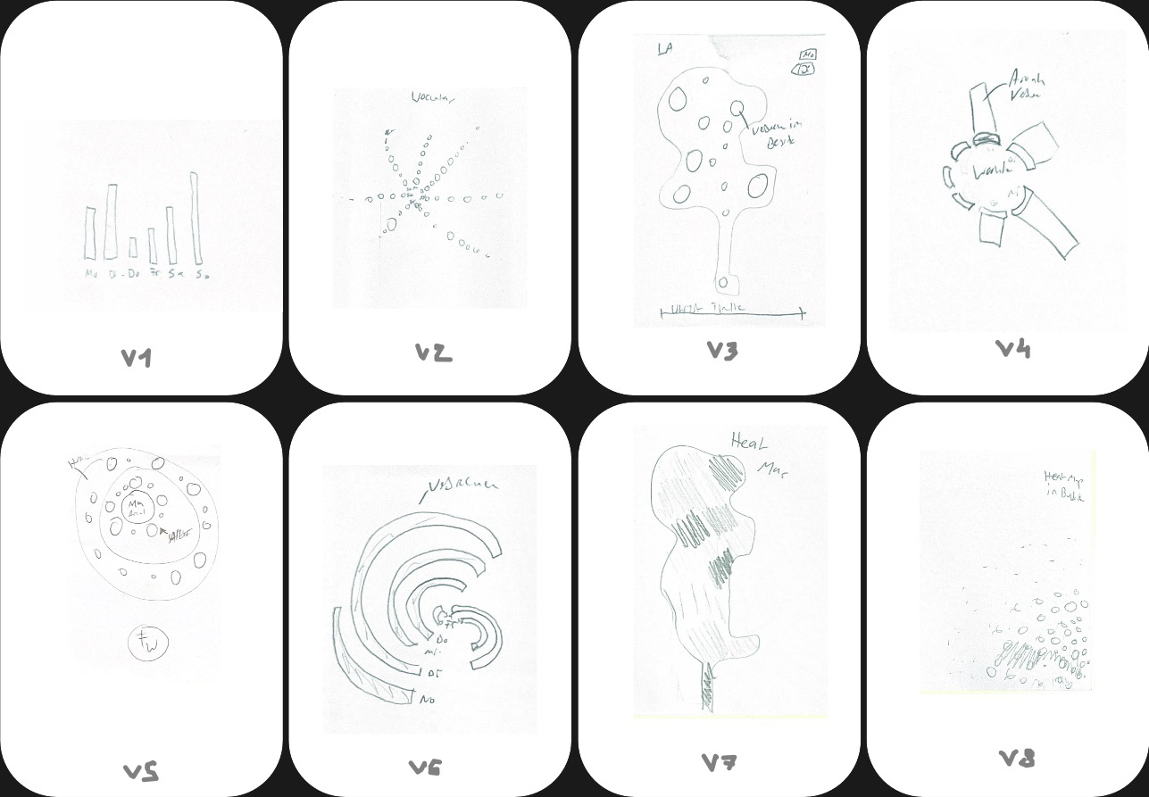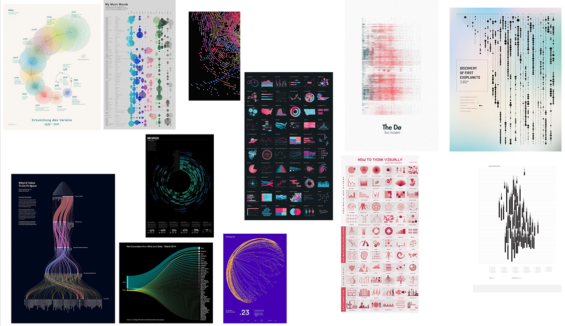 Bevor ich angefangen habe, meine Ideen zu skizzieren, habe ich nach Inspirationen auf Pinterest gesucht und mir ein Moodboard erstellt. Dies hat mir sehr weiter geholfen, da ich zu Beginn nicht wusste, wie ich anfangen sollte und wie man eine so große Datenmenge visualisieren könnte.