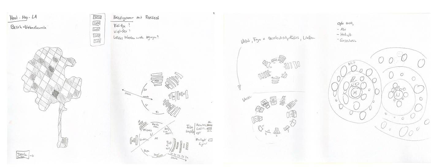 Anschließend habe ich die besten Ideen ausgewählt und detaillierter ausgearbeitet. Besonders überzeugt hat mich die Heatmap, da sie es ermöglicht, Informationen auf den ersten Blick schnell zu erfassen. Meine erste Idee war, Los Angeles in Rechtecke zu unterteilen, wobei die Anzahl der Verbrechen durch die Intensität der Färbung dargestellt werden sollte. An der Seite sollten Buttons stehen, um die Jahre zu vergleichen. Eine weitere Idee war, die Tage in einem Kreis anzuordnen, wobei die nach außen gerichteten Rechtecke den Tag und die nach innen gerichteten die Nacht repräsentieren. Durch gefüllte oder ungefüllte Rechtecke sollte zwischen Männern und Frauen unterschieden werden, und die Farbintensität sollte die Häufigkeit der Verbrechen darstellen. Mit der Kreisanordnung habe ich ebenfalls weitere Ideen getestet, aber letztendlich habe ich mich doch erst mal auf die Heatmap fokussiert.