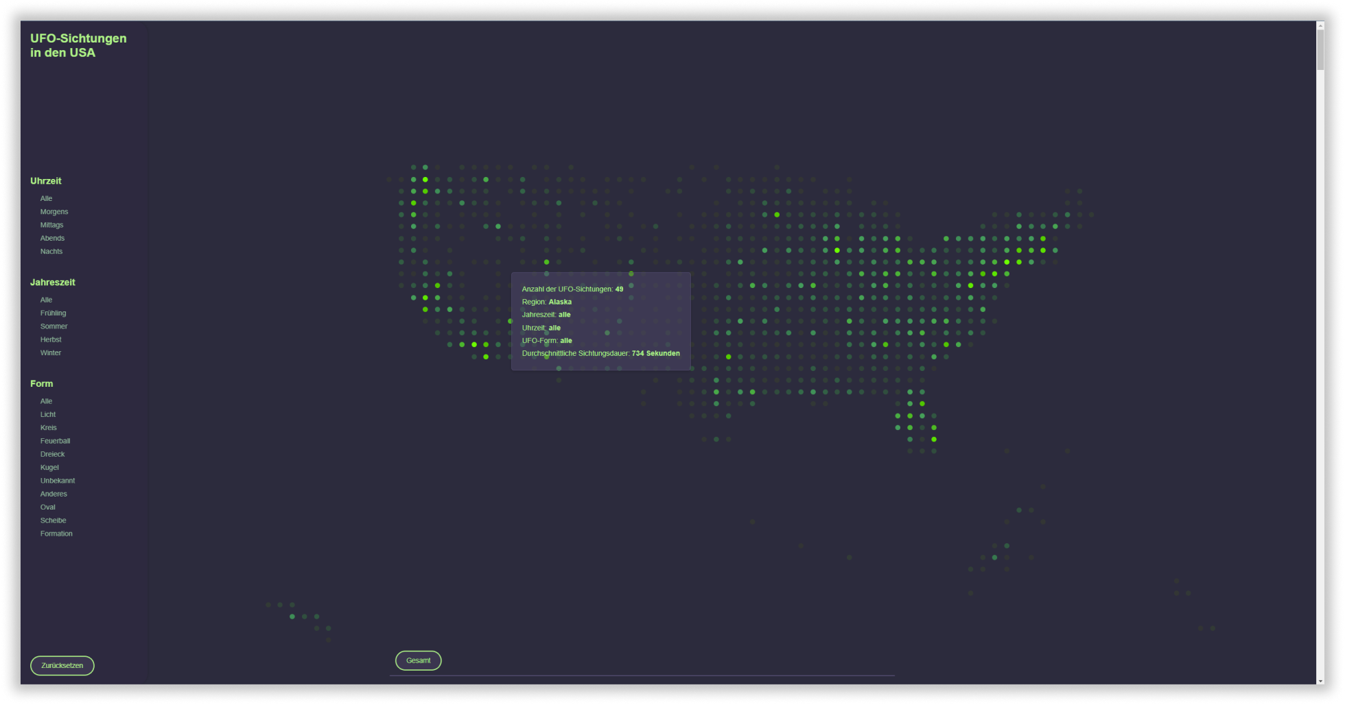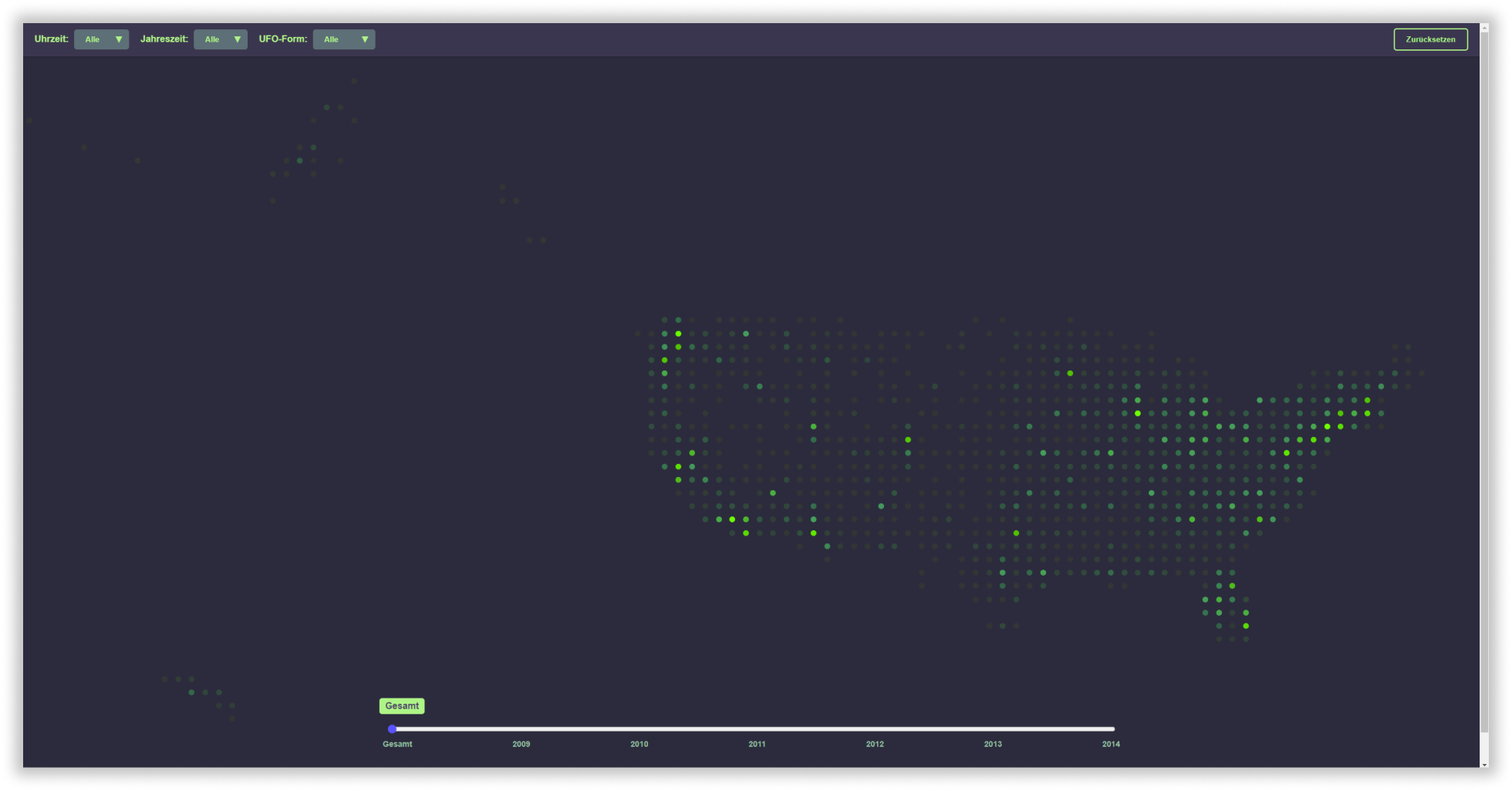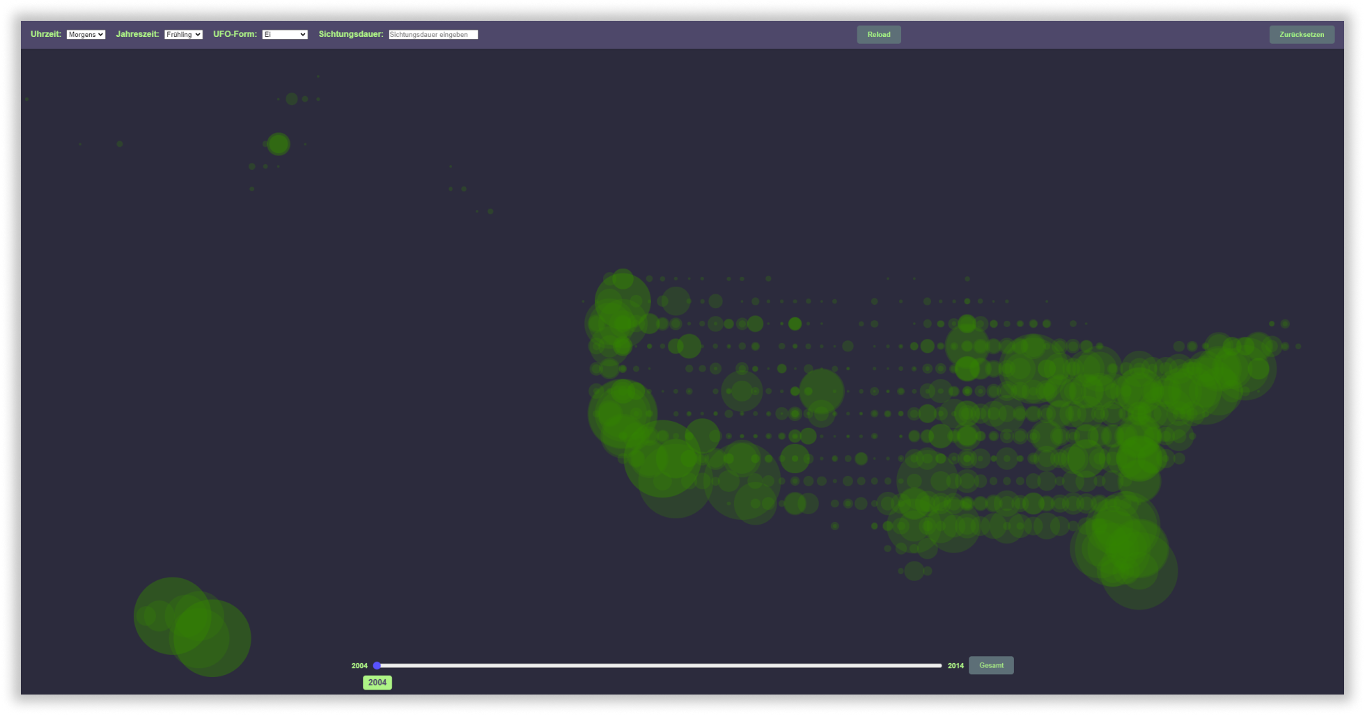 Zu Beginn habe ich eine andere Art von Heatmap erstellt, die den Radius je nach Anzahl der Sichtungen anpasst. Außerdem wurde erstmals eine Navigation mit Dropdown-Menü integriert, obwohl sie zusammen mit den Reload- und Reset-Buttons noch nicht funktionierte. Es gab auch ein erstes Styling und einen Slider.