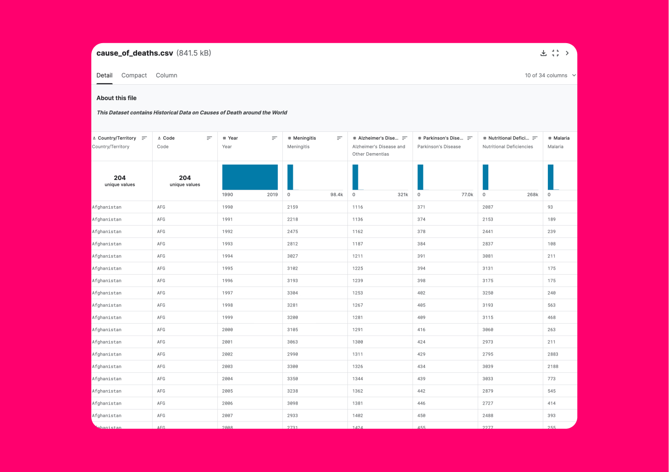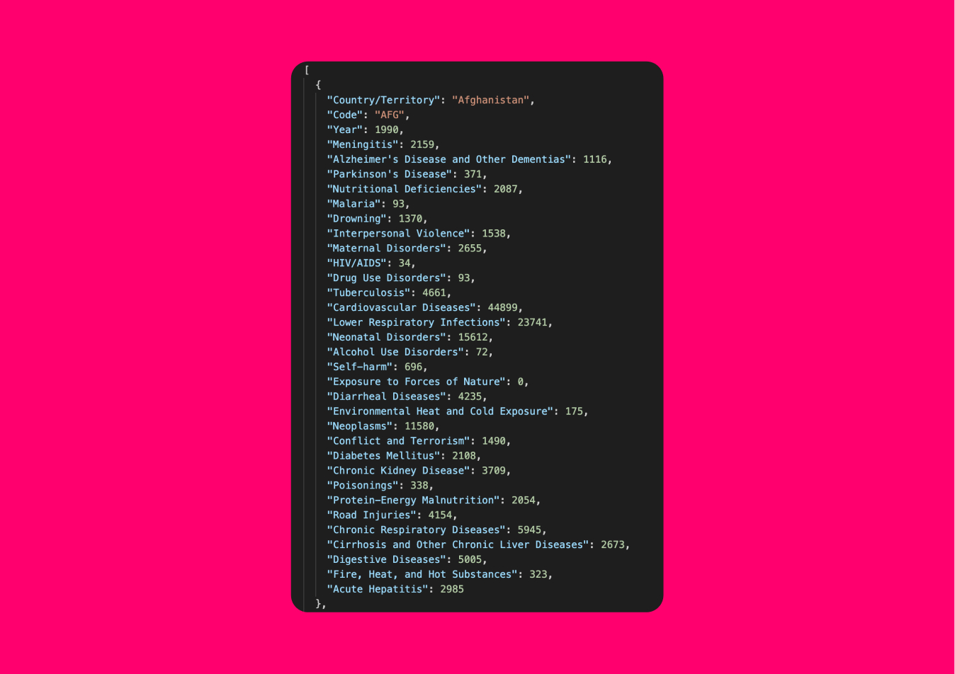 - Todesursachen: 30 verschiedene Kategorien von Todesursachen, darunter Krankheiten wie Malaria, HIV/AIDS, Krebs und Herz-Kreislauf-Erkrankungen sowie andere Ursachen wie Verkehrsunfälle und Gewalt.