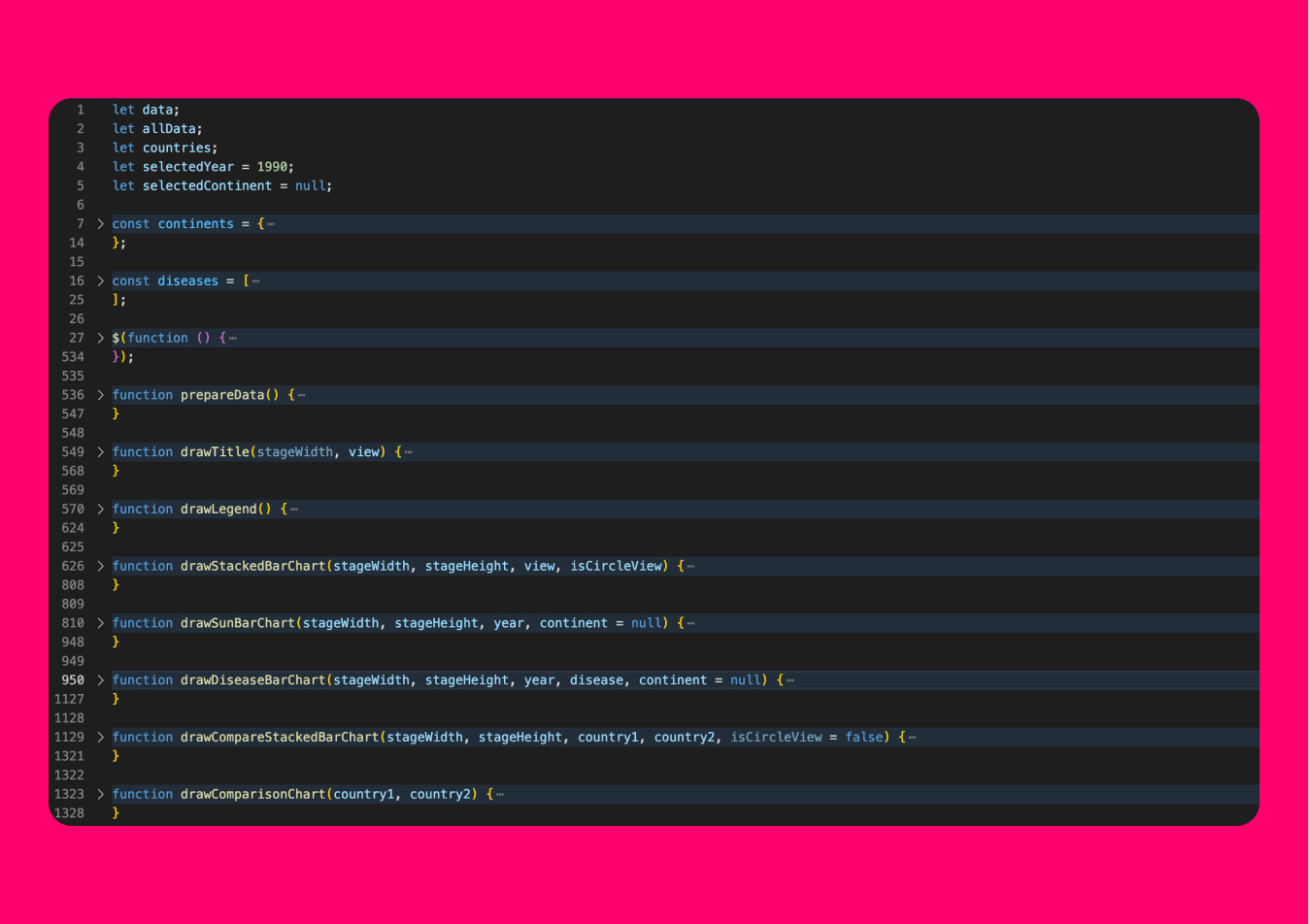 In meiner main.js-Datei habe ich für jede Ansicht eine Funktion aufgebaut, um die verschiedenen Funktionen und Visualisierungen besser umsetzen zu können. Diese Struktur ermöglicht es mir, die Ansichten klar zu trennen und flexibel anzupassen.