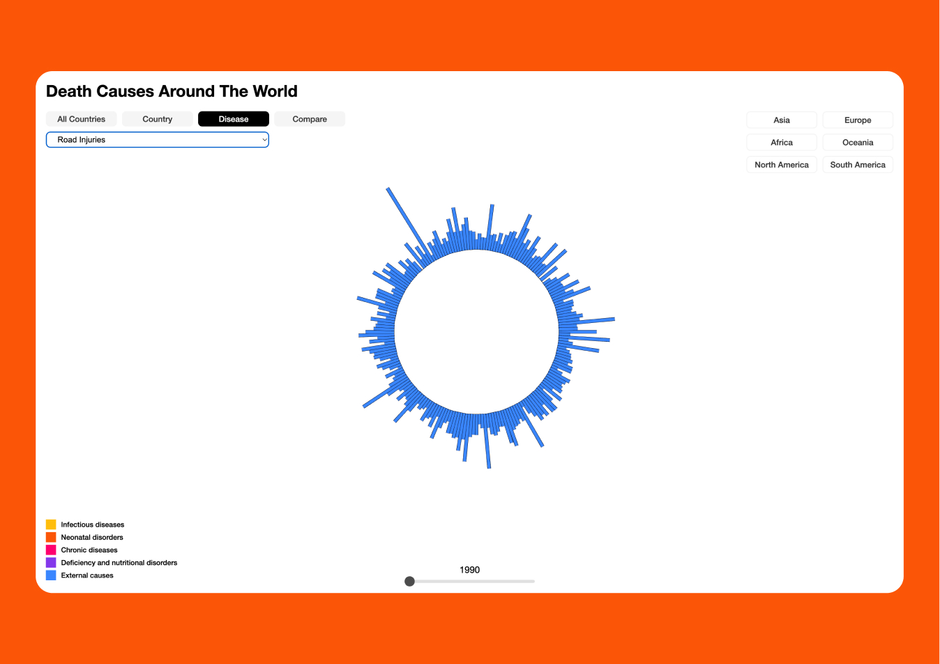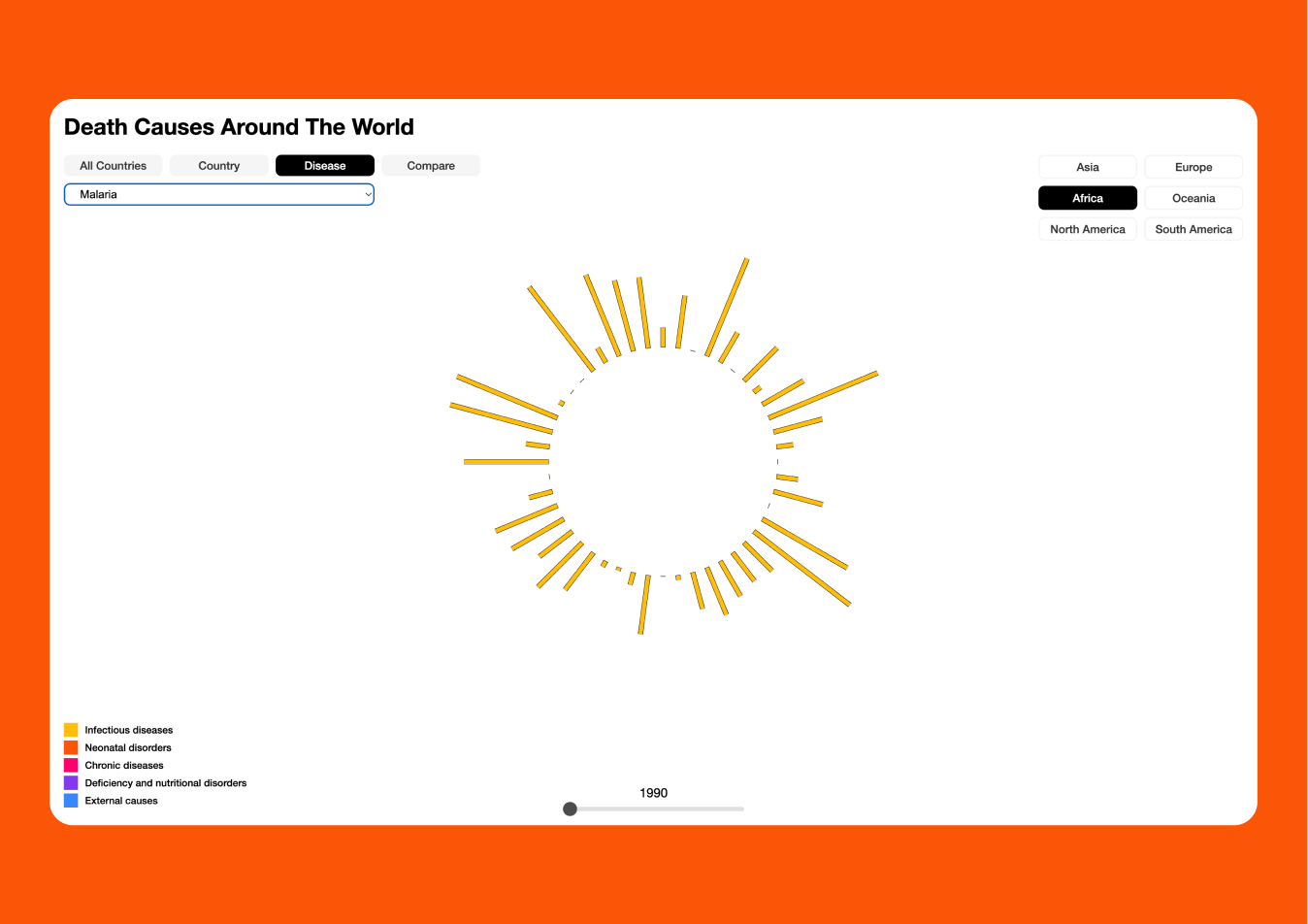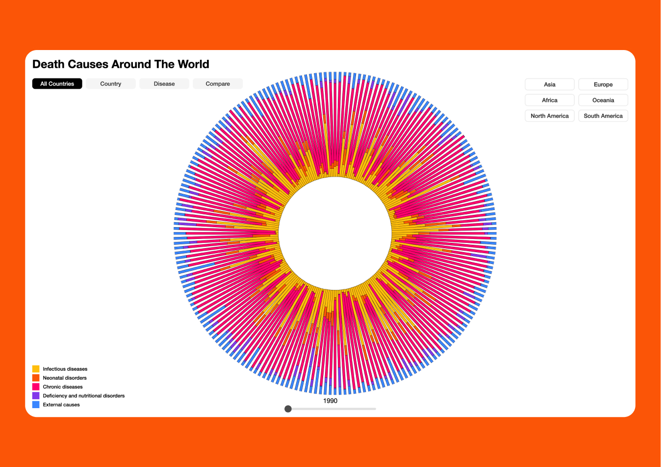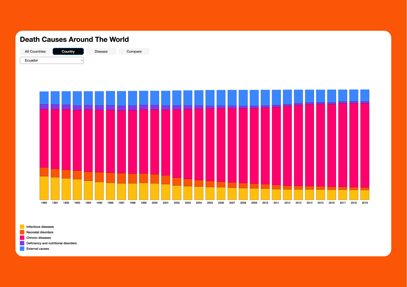 Mit dem Disease-Dropdown kann man zwischen den 30 Todesursachen jedes Landes unterscheiden und spezifische Trends und Muster identifizieren.