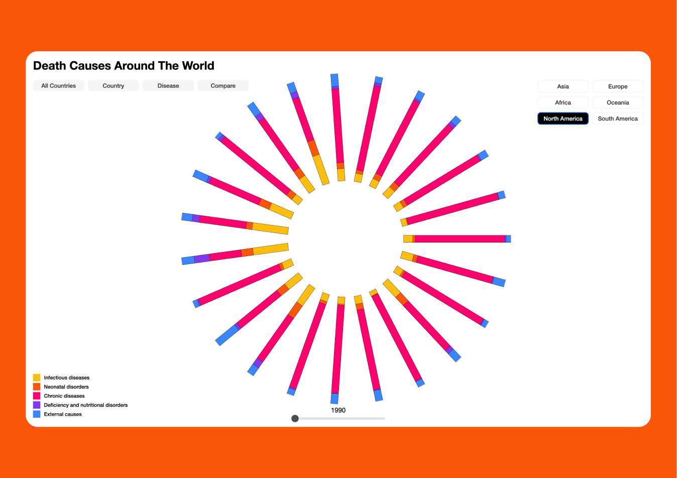 Mit der All Country Ansicht kann man die Stacked Bar Charts jedes Landes um einen Kreis herum sehen. Diese Anordnung bietet einen umfassenden Überblick über die Todesursachen weltweit.
