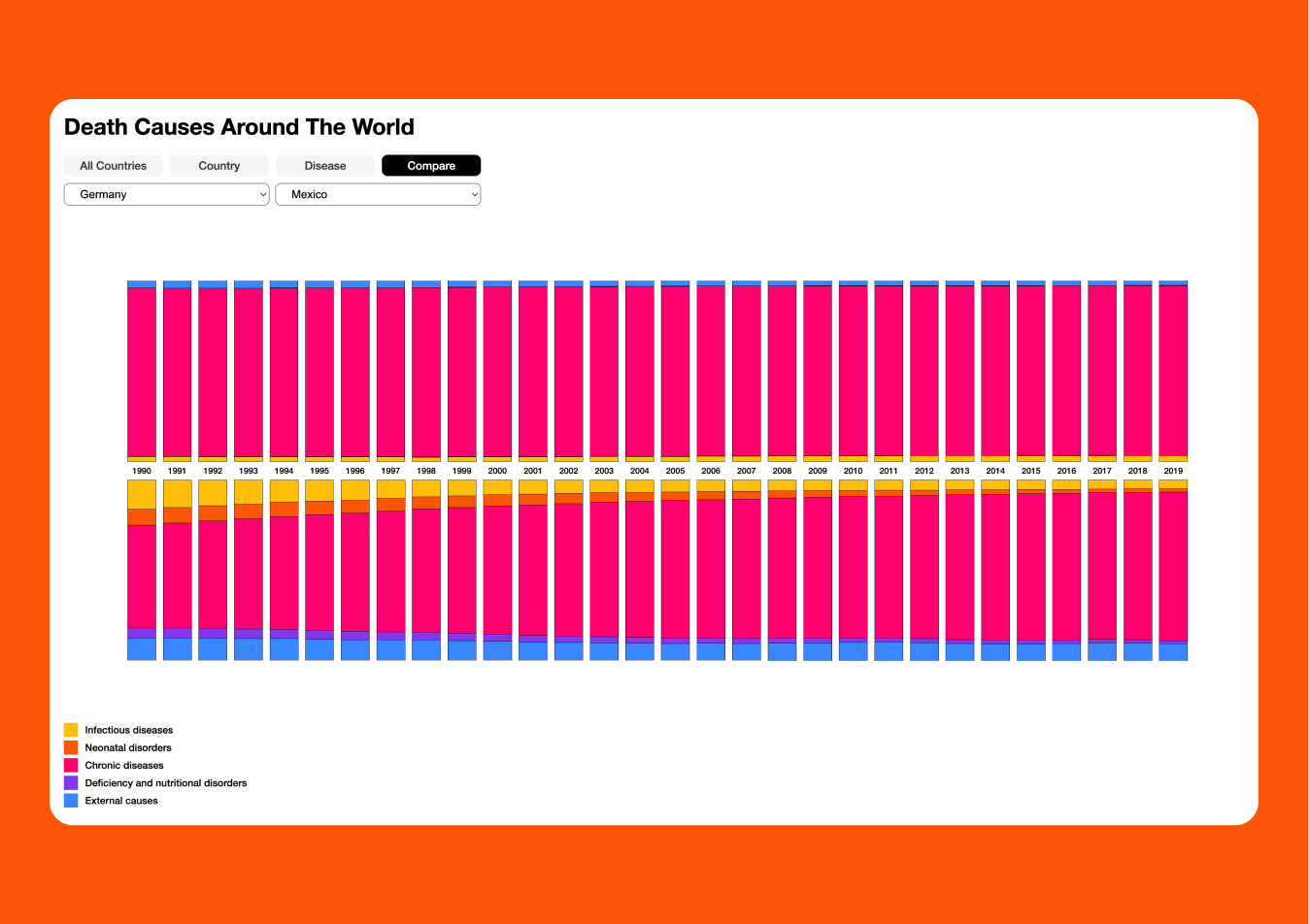 In den beiden Dropdown-Menüs kann man jeweils eines der 195 Länder auswählen und so die Stacked Bar Charts dieser Länder vergleichen. Dies bietet eine klare visuelle Darstellung der Unterschiede in den Todesursachenverhältnissen.