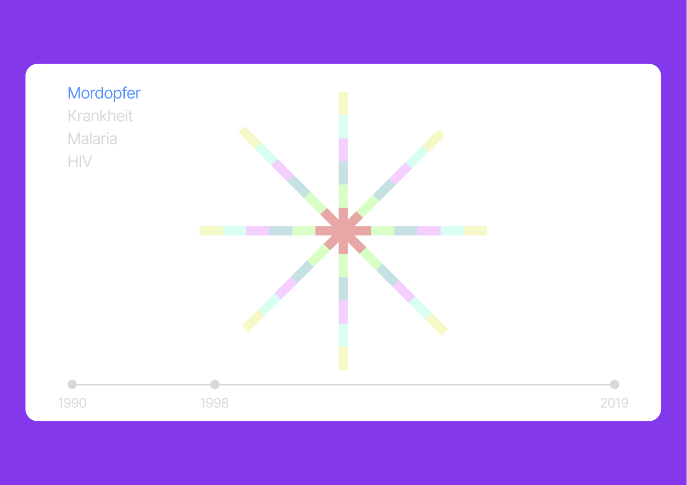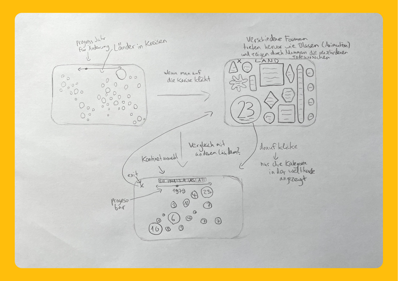 Dabei stellte ich fest, dass ich eher gestalterisch gearbeitet habe und weniger auf die konkrete Aufgabenstellung geachtet habe, eine abstrakte Darstellung zu konstruieren. In diesen ersten Skizzen habe ich versucht, die Todesursachen weltweit mit verschiedenen Größen von Kreisen darzustellen.